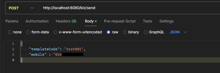 템플릿코드와 핸드폰 번호를 추가해 테스트해봅니다.