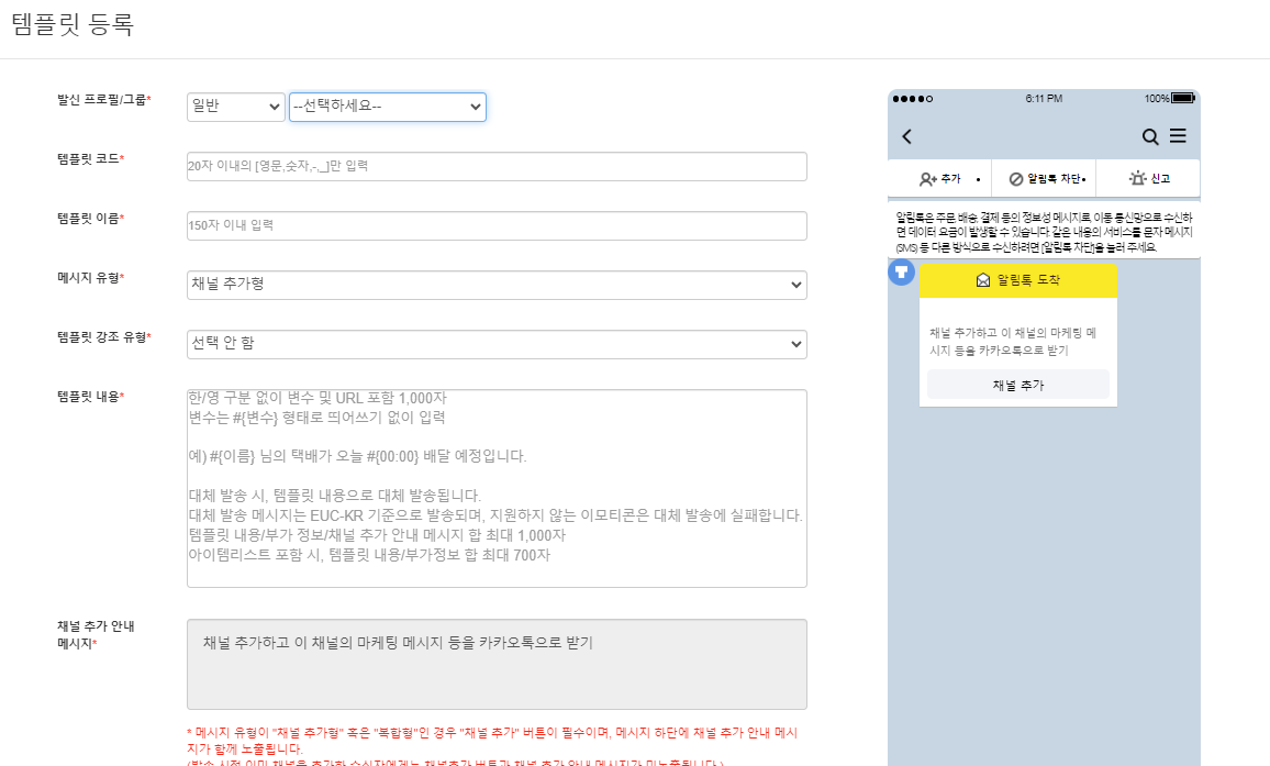 템플릿 등록을 통해 각 내용을 기입합니다. 템플릿 내용에는 변수를 사용할 수 있습니다.