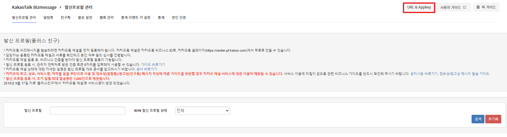 발신키는 발신 프로필에서 확인할 수 있고, API 키는 아래 화면에서 확인할 수 있습니다.