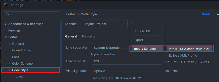 인텔리제이 실행 후 File - Settings - Editor - Code Style을 확인합니다.