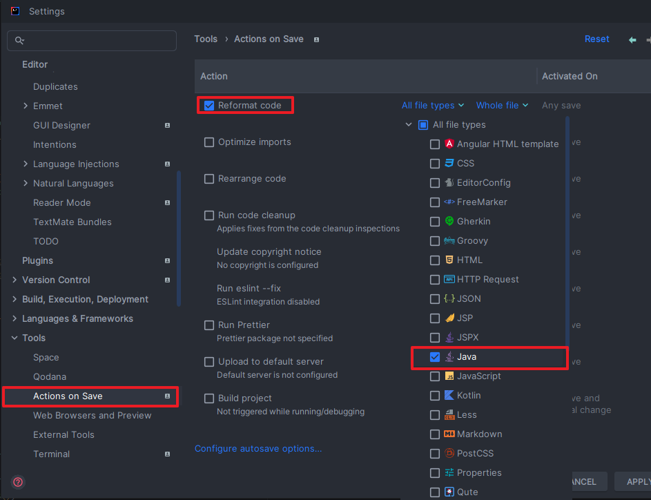 Reformat Code를 체크하고 파일 타입에 Java를 선택해줍니다.