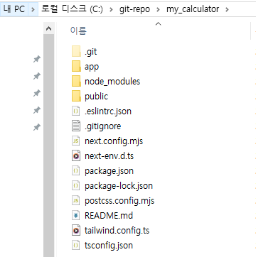 이 곳에 프로젝트를 만들어보겠습니다. npx 명령어와 함께 next.js 프로젝트를 생성합니다. 프로젝트명은 my_calculator로 하겠습니다. 타입스크립트를 사용하기 때문에 --ts 명령어도 추가해줍니다. 이후에 나오는 질문들은 기본값으로 체크하고 넘어갑니다.