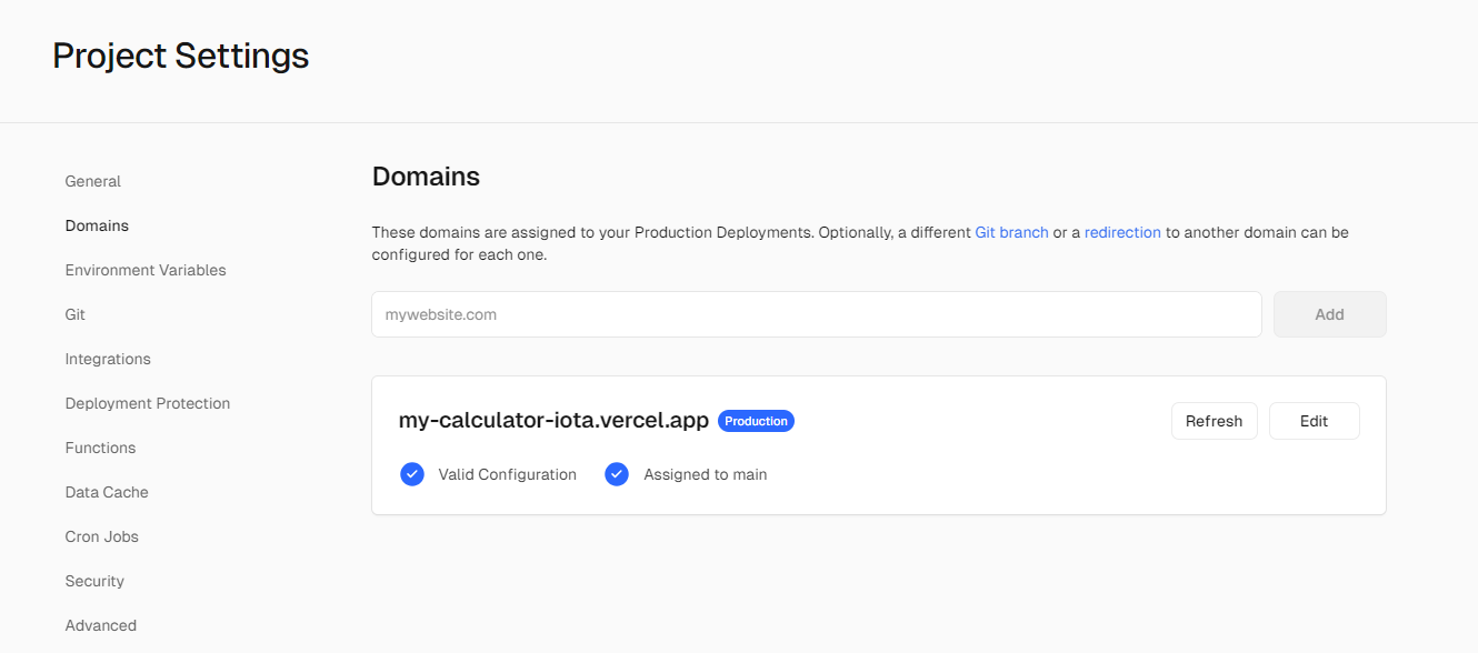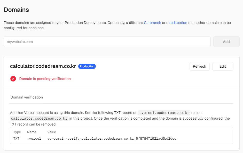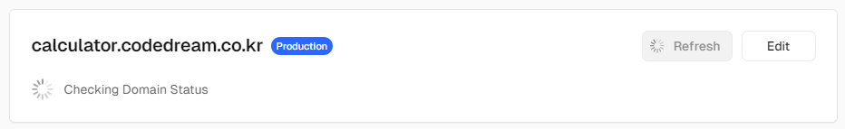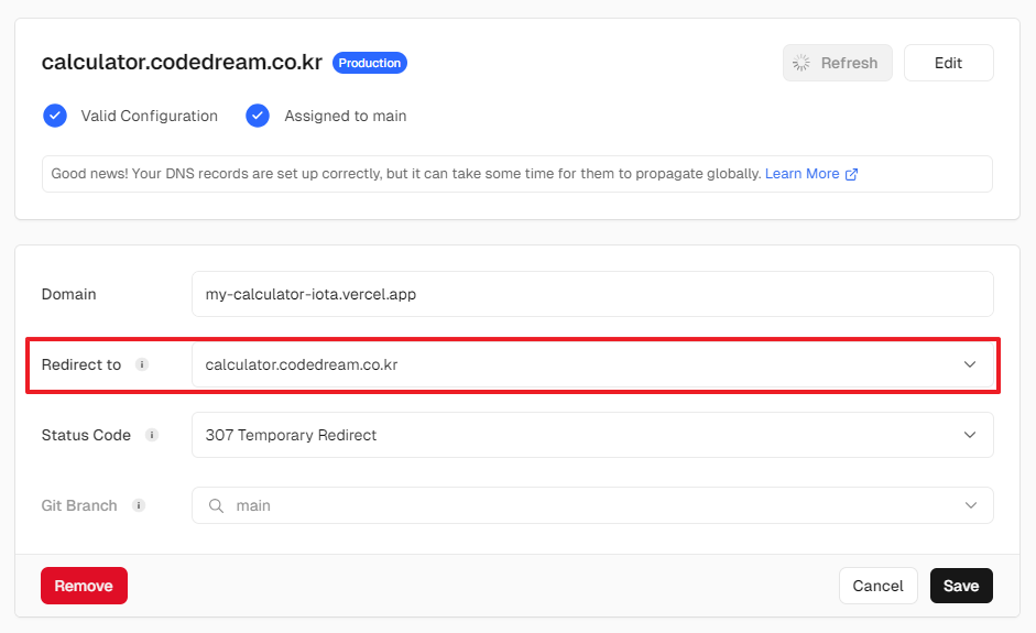 10. 기존 Vercel에서 제공해준 도메인을 리다이렉트 시킬 수도 있습니다. Edit 버튼 클릭 후에 리다이렉트를 새로 등록한 도메인으로 연결해줍니다.