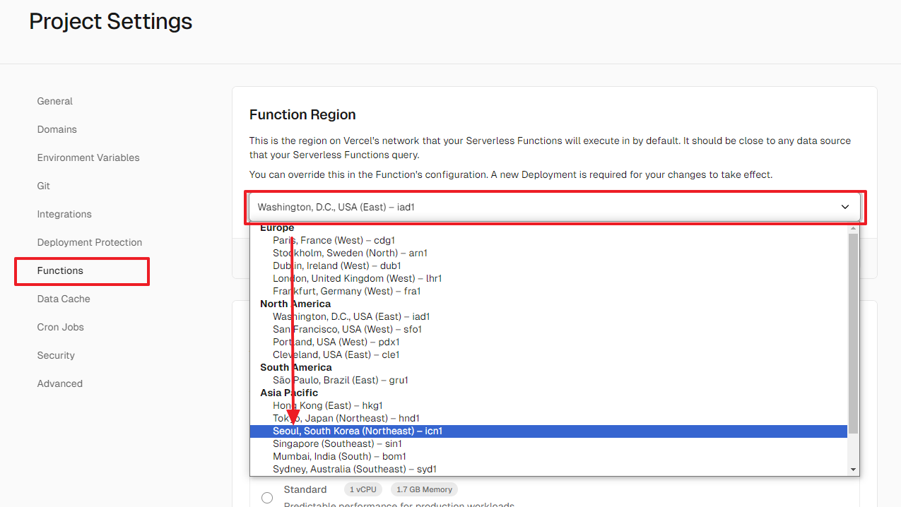 Vercel은 서버리스 방식의 배포 플랫폼으로 서버를 관리할 필요 없이 코드를 배포하고 실행할 수 있습니다. 이러한 서버리스 플랫폼은 FaaS(Function as a Service)의 한 유형으로, 프로젝트를 여러 개의 함수로 분할하여 필요에 따라 각 함수를 실행할 수 있습니다. 이 함수들은 분산된 네트워크에 등록되어 있으며 필요할 때마다 실행됩니다. 이 때 함수의 지역을 한국으로 바꿔주면 조금 더 나은 속도를 가져갈 수 있습니다.