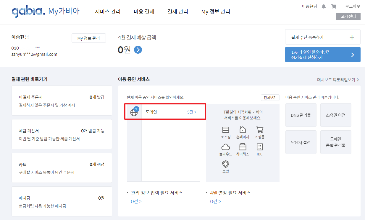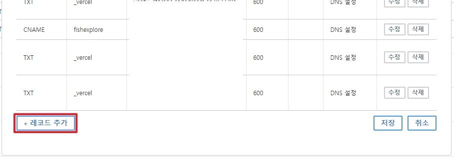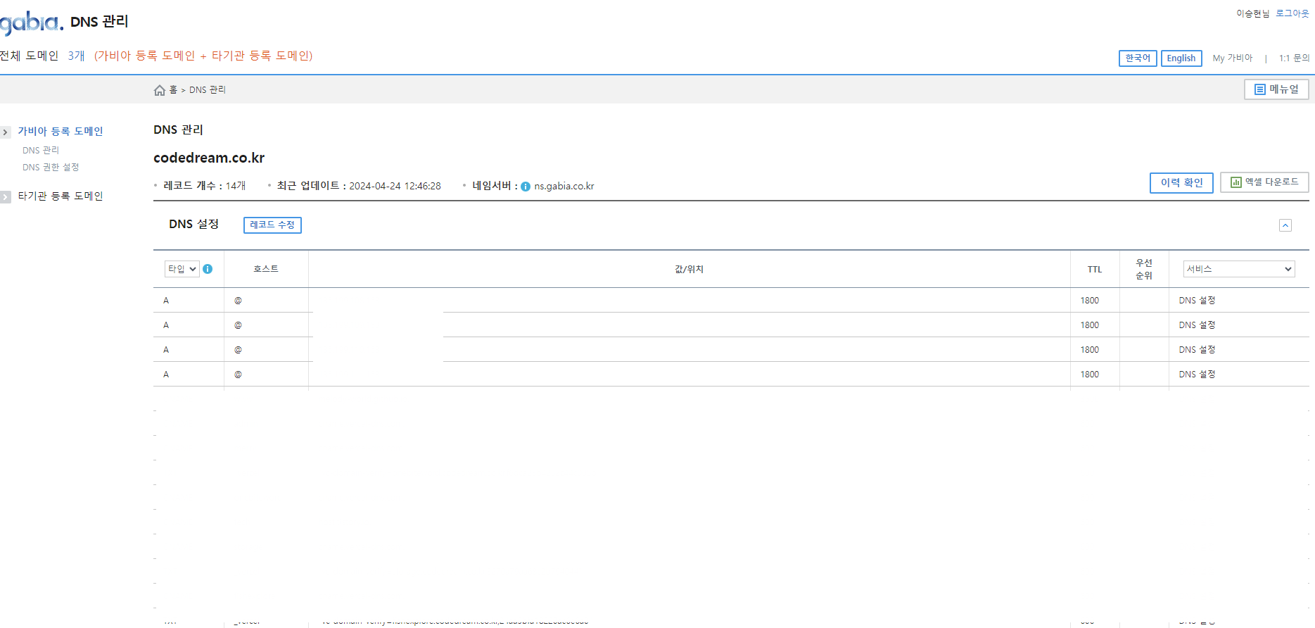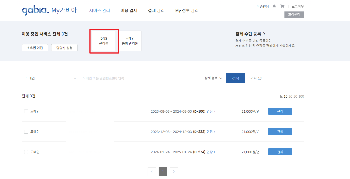 표시된 레코드값을 등록해줘야합니다. 3-1. 3으로 돌아가서 이용 중인 서비스의 도메인을 클릭하면 아래와 같이 DNS 관리툴이 조회됩니다. DNS 관리툴을 클릭합니다.