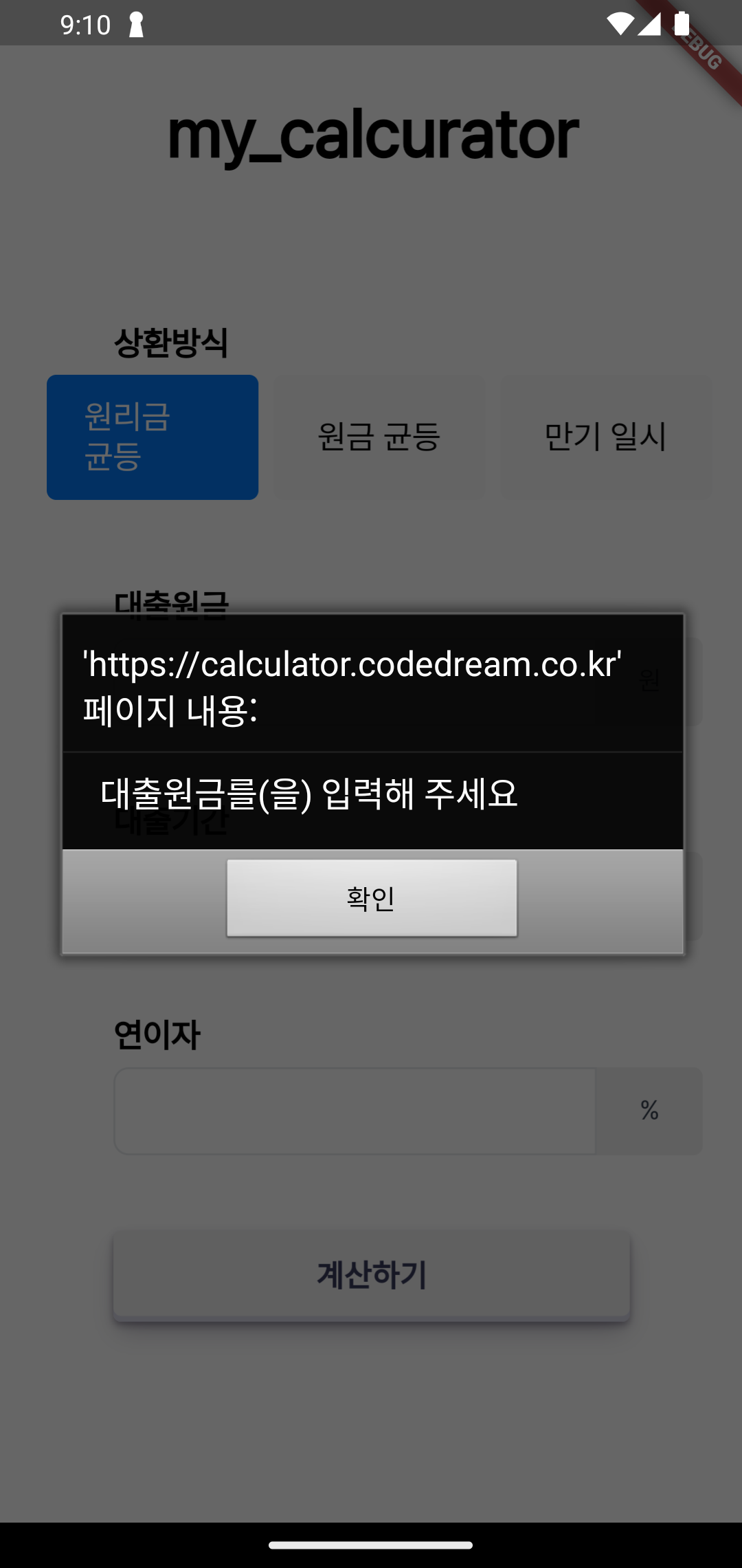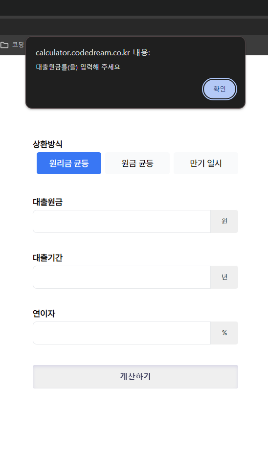 예를 들면 현재 프로젝트에서 값을 입력하지 않은 경우 계산하기를 클릭하게 되면 alert 알림창을 확인할 수 있는데요. 이걸 앱에서 보면 어떻게 될까요?