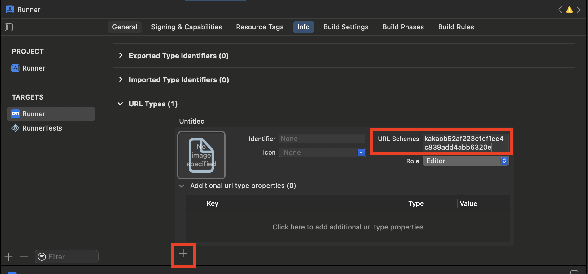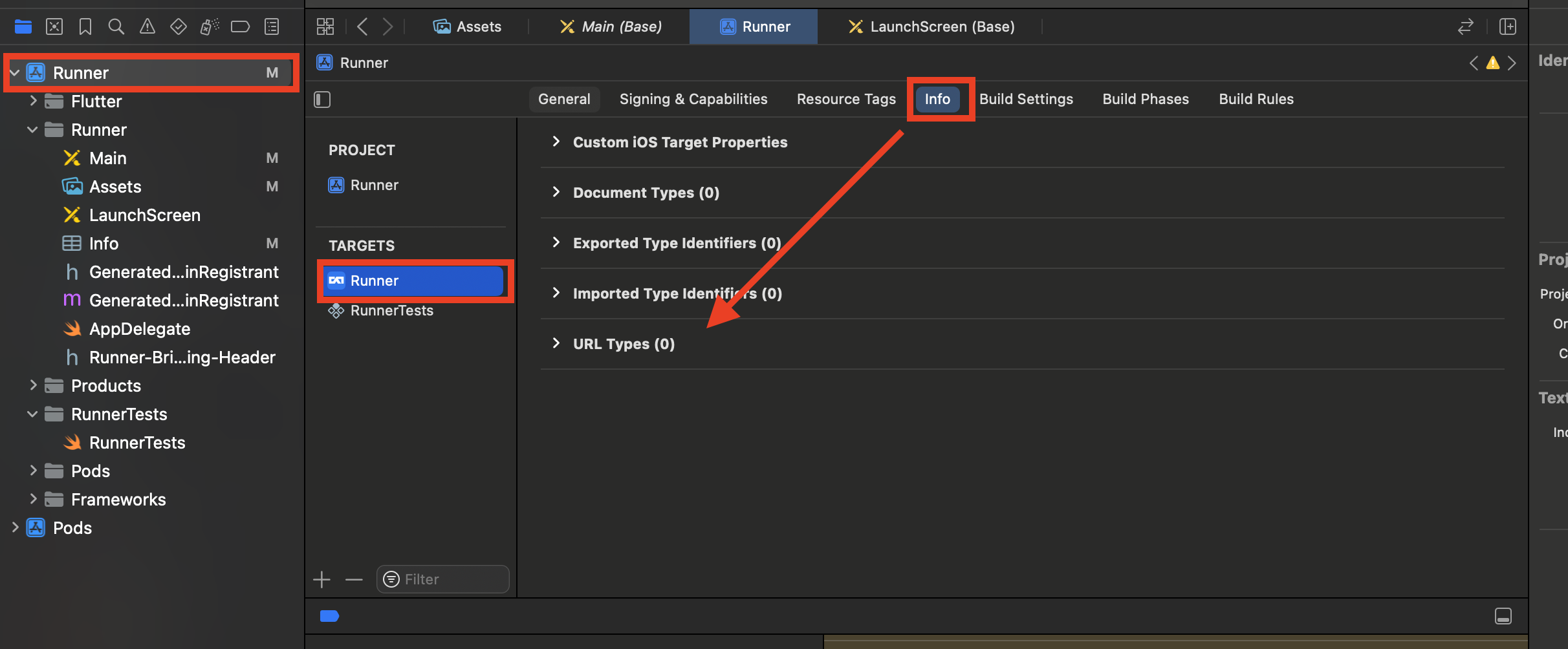 Runner - TARGETS(Runner) - Info - URL Types를 클릭합니다.