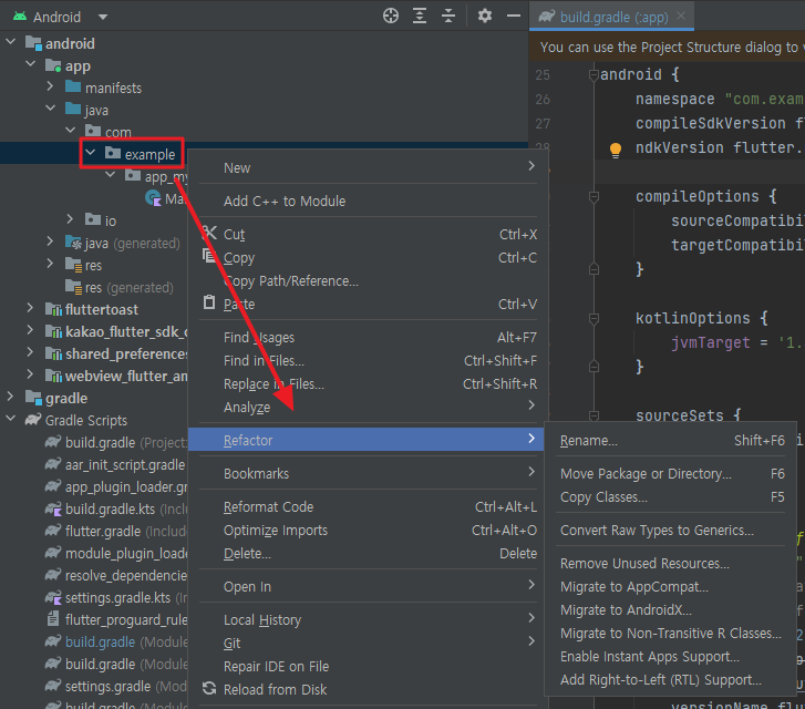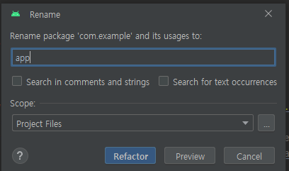 Android 먼저 수정해보겠습니다. 안드로이드 스튜디오를 실행하고 example 패키지 우클릭 후 Refactor - Rename을 통해 이름을 com.example.app_my_calculator에서 com.app.app_my_calculator로 바꾸겠습니다.