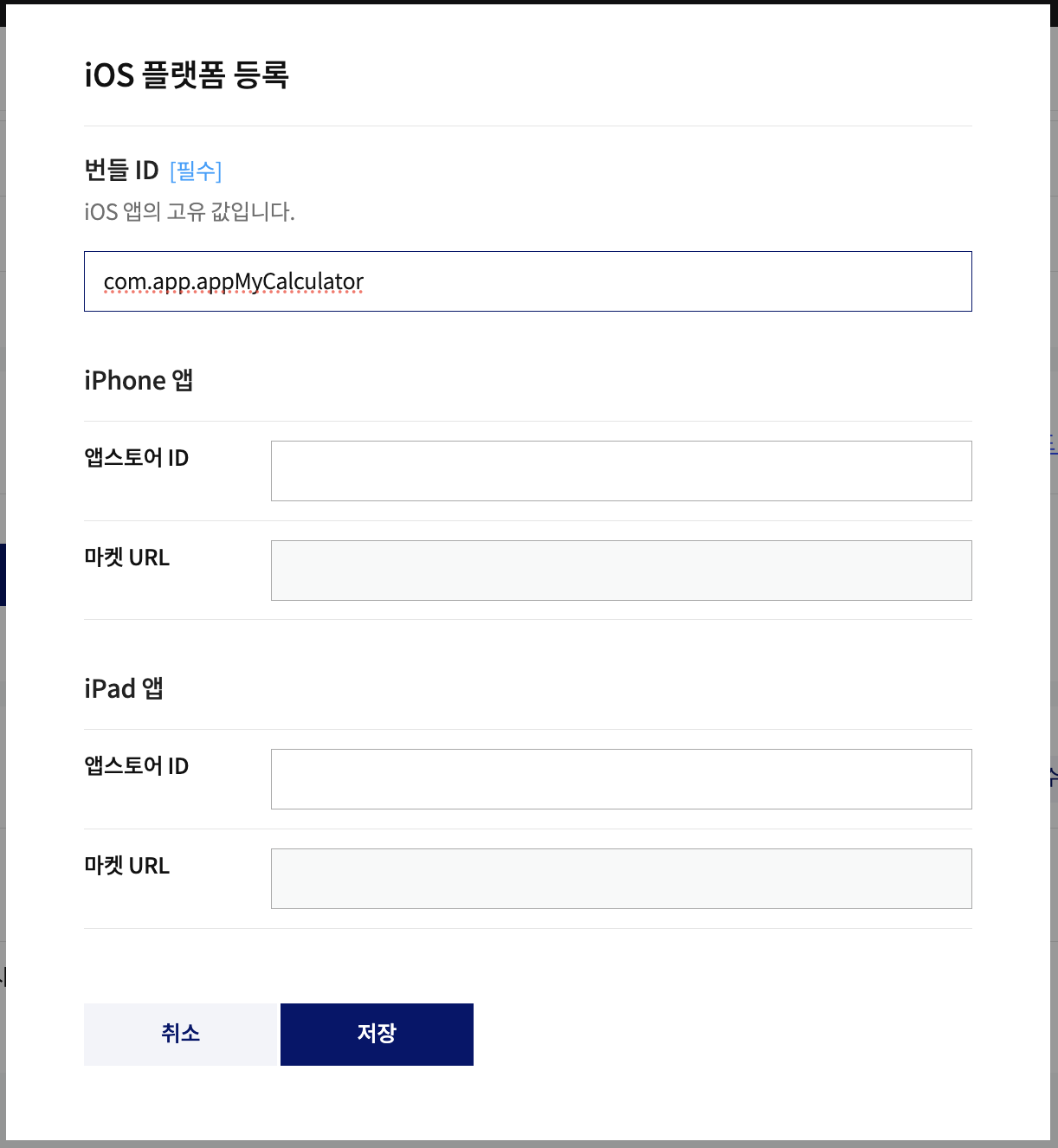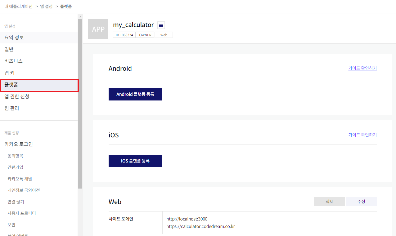 플랫폼 - Android/iOS 플랫폼 등록을 클릭합니다. 각 플랫폼별 변경한 패키지명을 등록합니다.