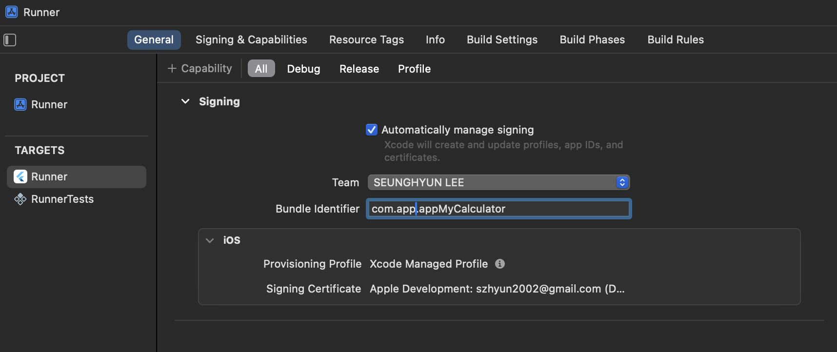 Xcode 실행 후 Runner - General 탭에서 Bundle Identifier를 클릭하고 패키지명을 바꿔줍니다.