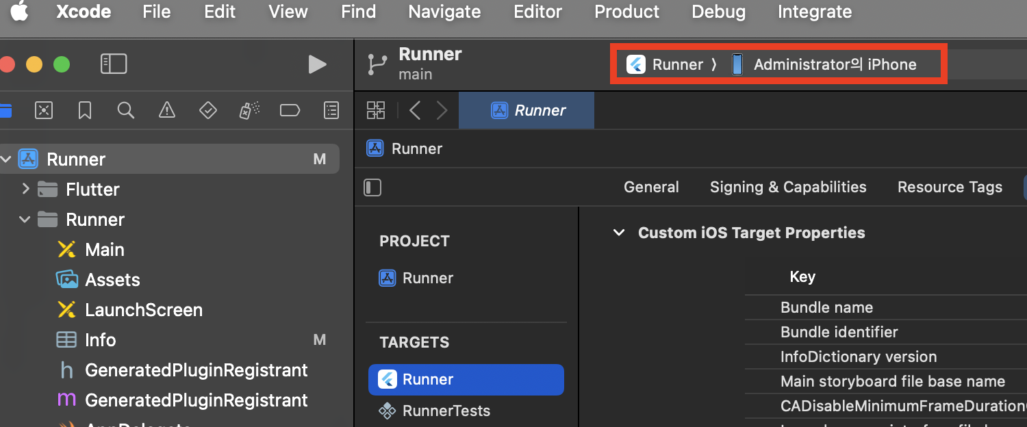맥북과 아이폰 연결 후 Xcode를 실행합니다. Runner에 본인 아이폰을 선택 후에 Product - Run을 실행합니다.