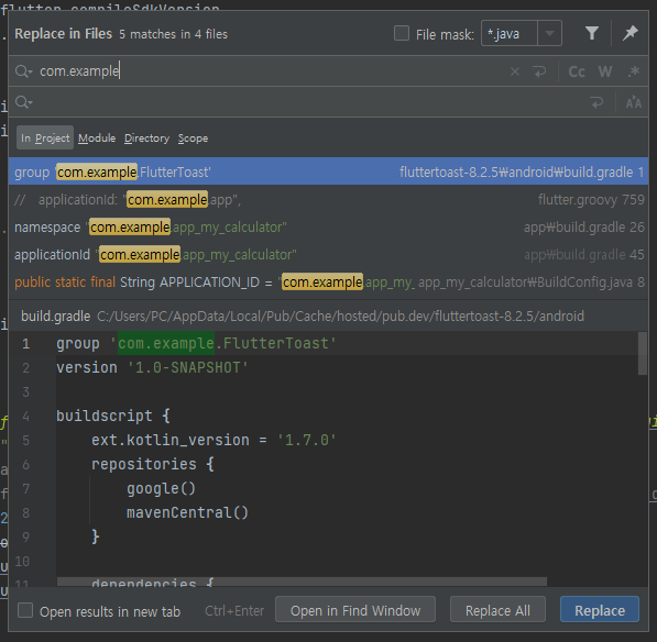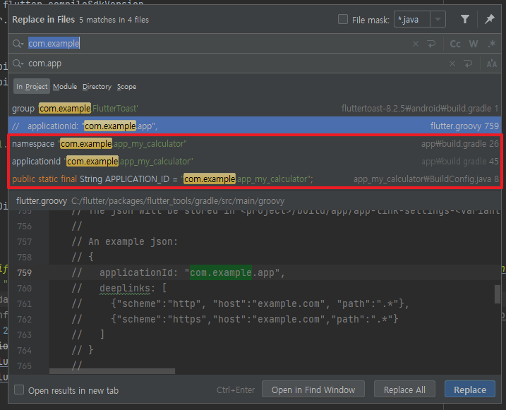 Command + Shift + R을 입력해 com.example이 포함된 파일을 모두 검색합니다. 파일을 클릭하고 변경된 패키지명을 입력합니다.