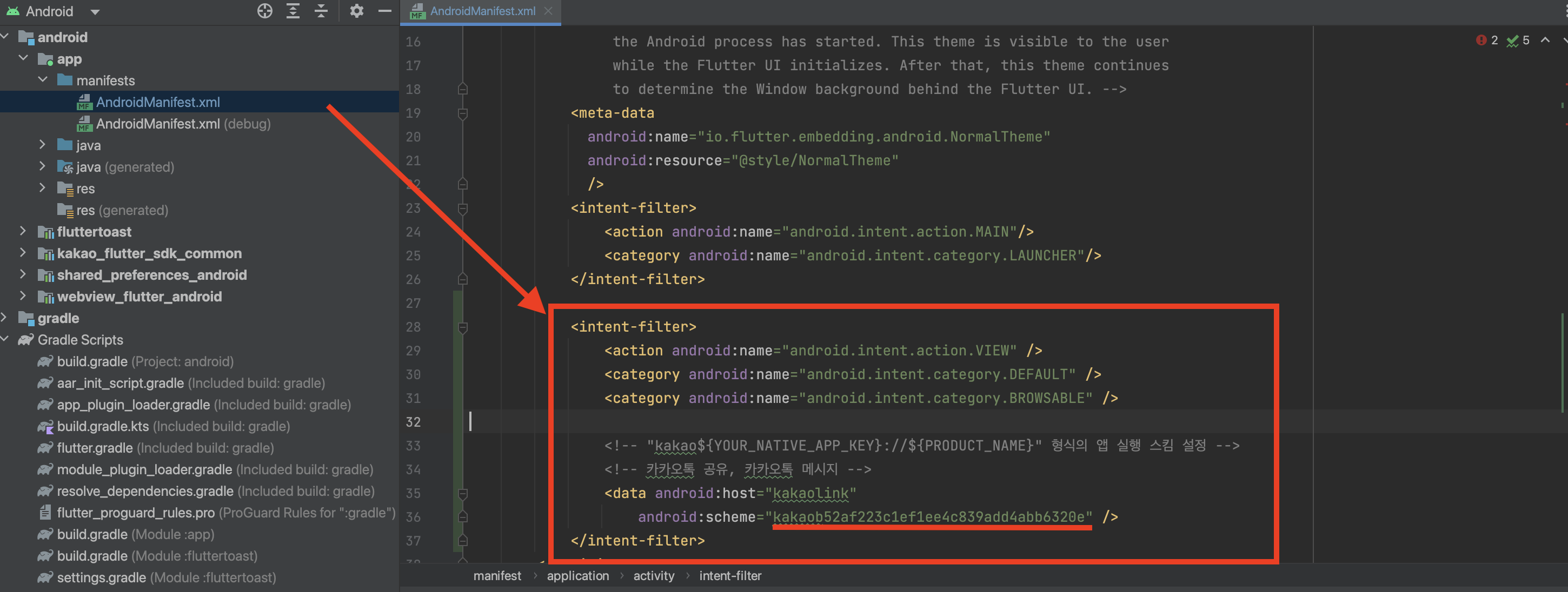 app - manifests - AndroidManifest.xml에 아래 코드를 추가합니다. android:scheme에는 kakao + 네이티브앱키 형태로 값을 입력합니다.