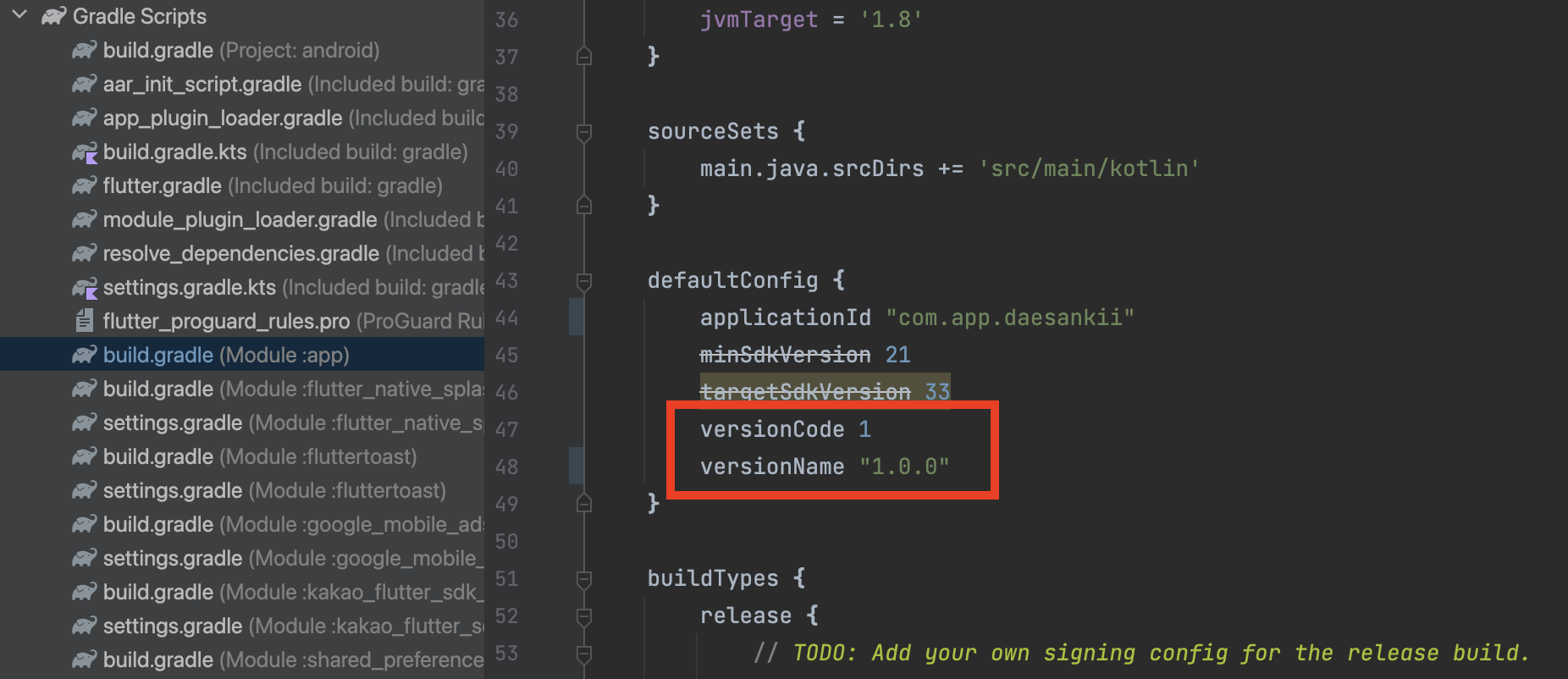 Gradle Scripts - build.gradle(Module:app) 파일을 열어 defaultConfig에 versionCode를 1로 지정하고 versionName을 "1.0.0"으로 지정합니다.