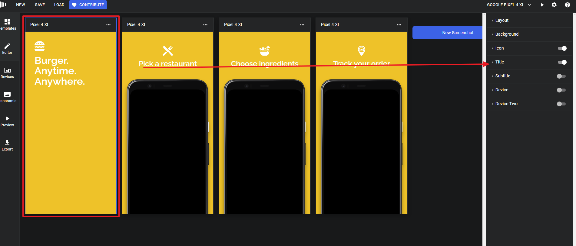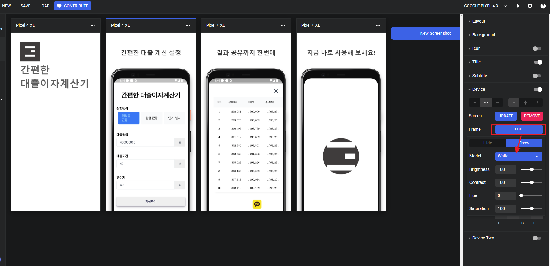 화면 클릭 후 우측 Layout, Background, Icon, Title, Subtitle, Device, Device Tow(두개의 디바이스를 표시하는 경우)를 통해 스크린샷을 꾸밀 수 있습니다.