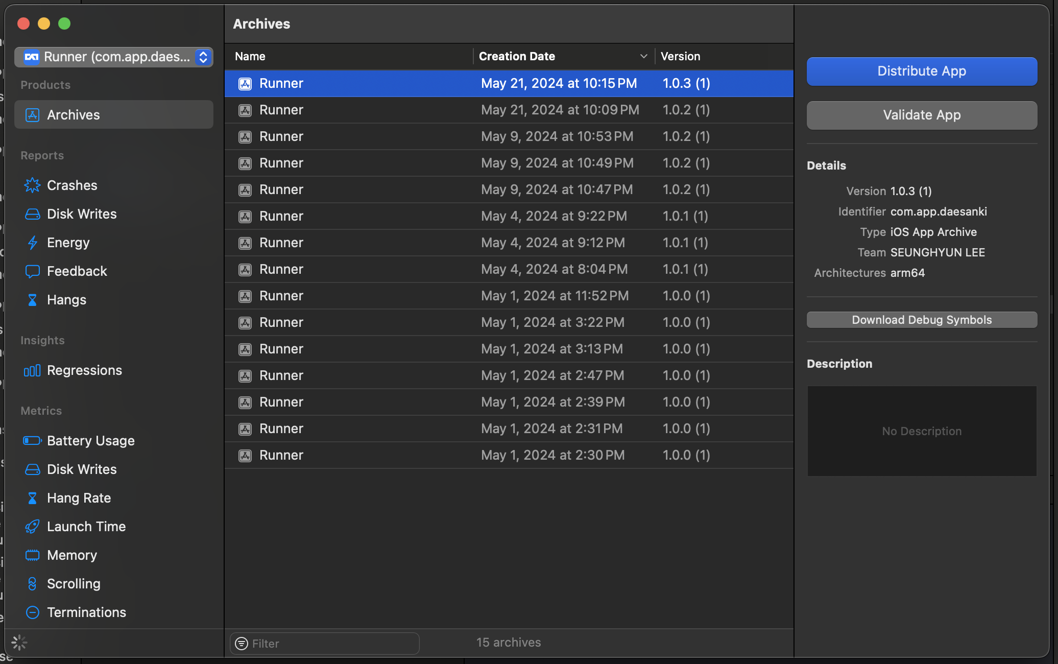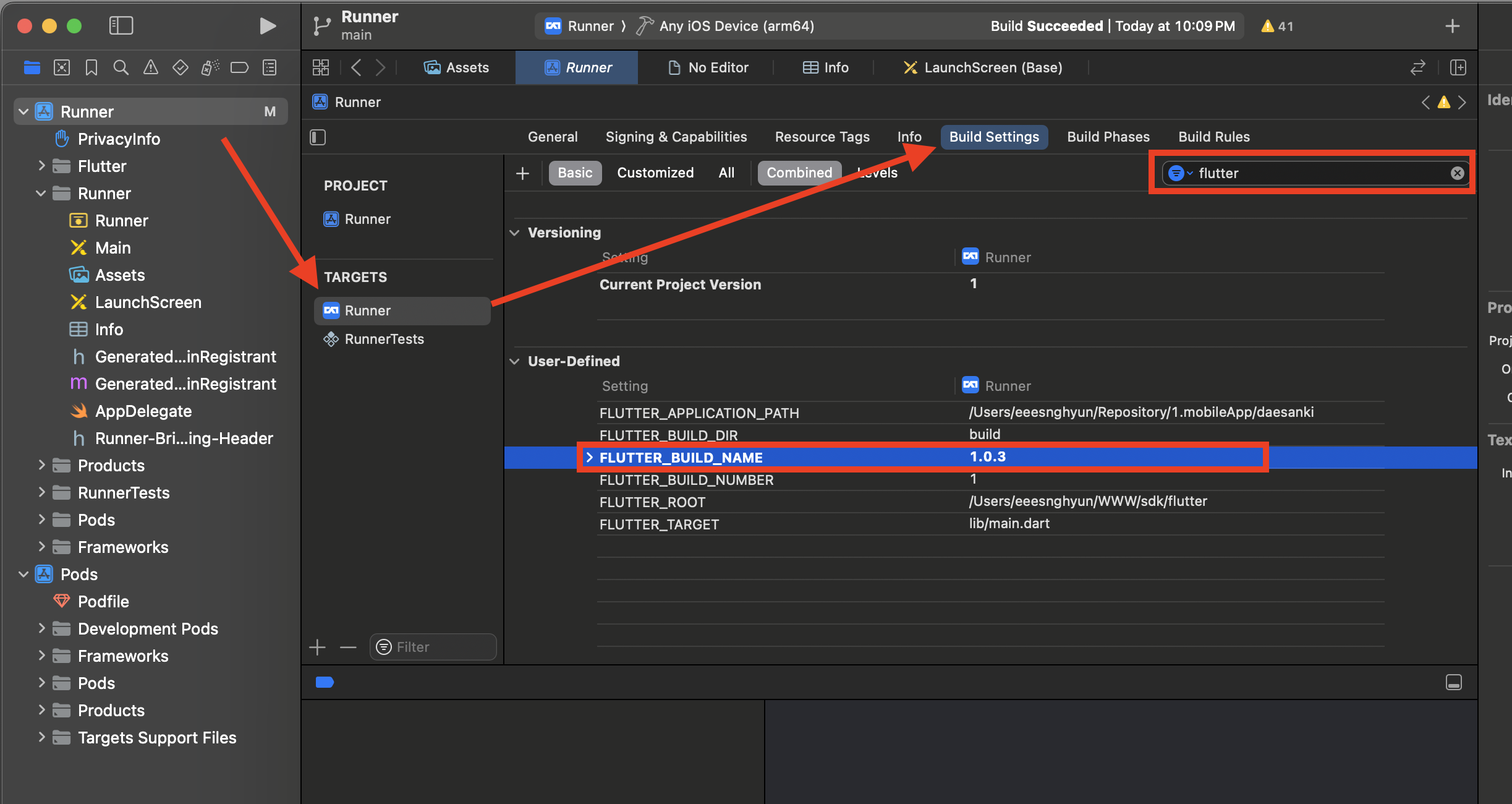 새로운 버전 빌드시에는 Runner(TARGETS) - Build Settings에서 flutter 검색 후 FLUTTER_BUILD_NAME을 변경합니다. FLUTTER_BUILD_NAME이 앱 스토어에 표시되는 앱 버전이 됩니다.