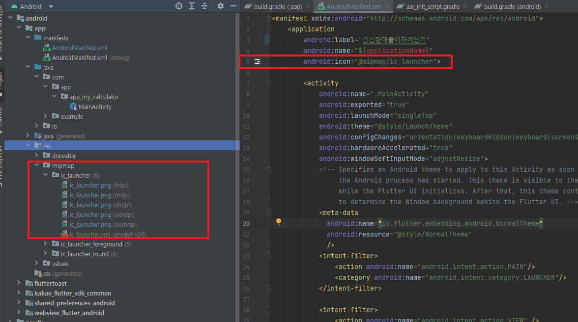 res - mipmap - ic_launcher에 앱 아이콘이 추가되며 AndroidManifest.xml에서 변경된 아이콘을 확인할 수 있습니다.