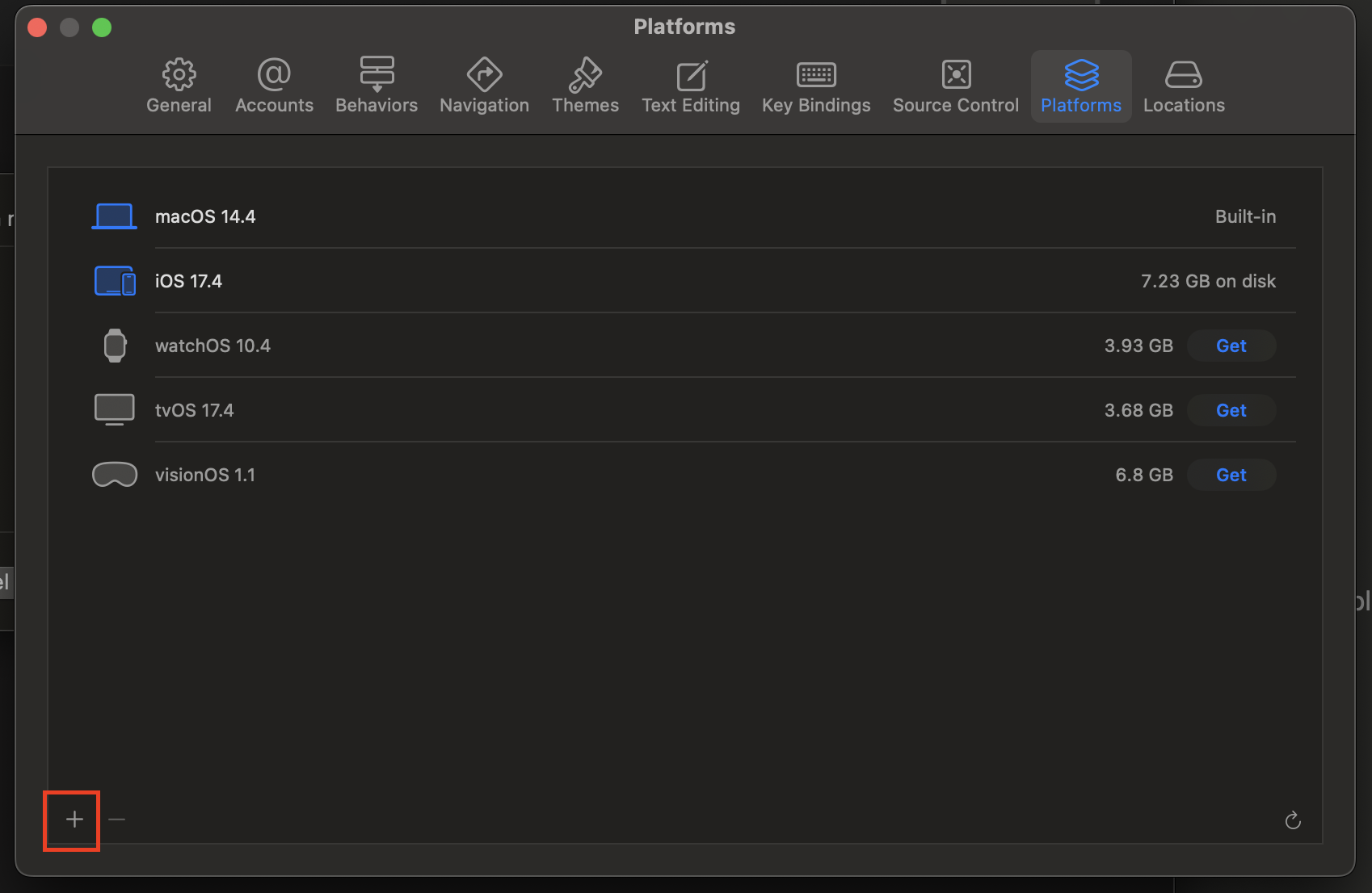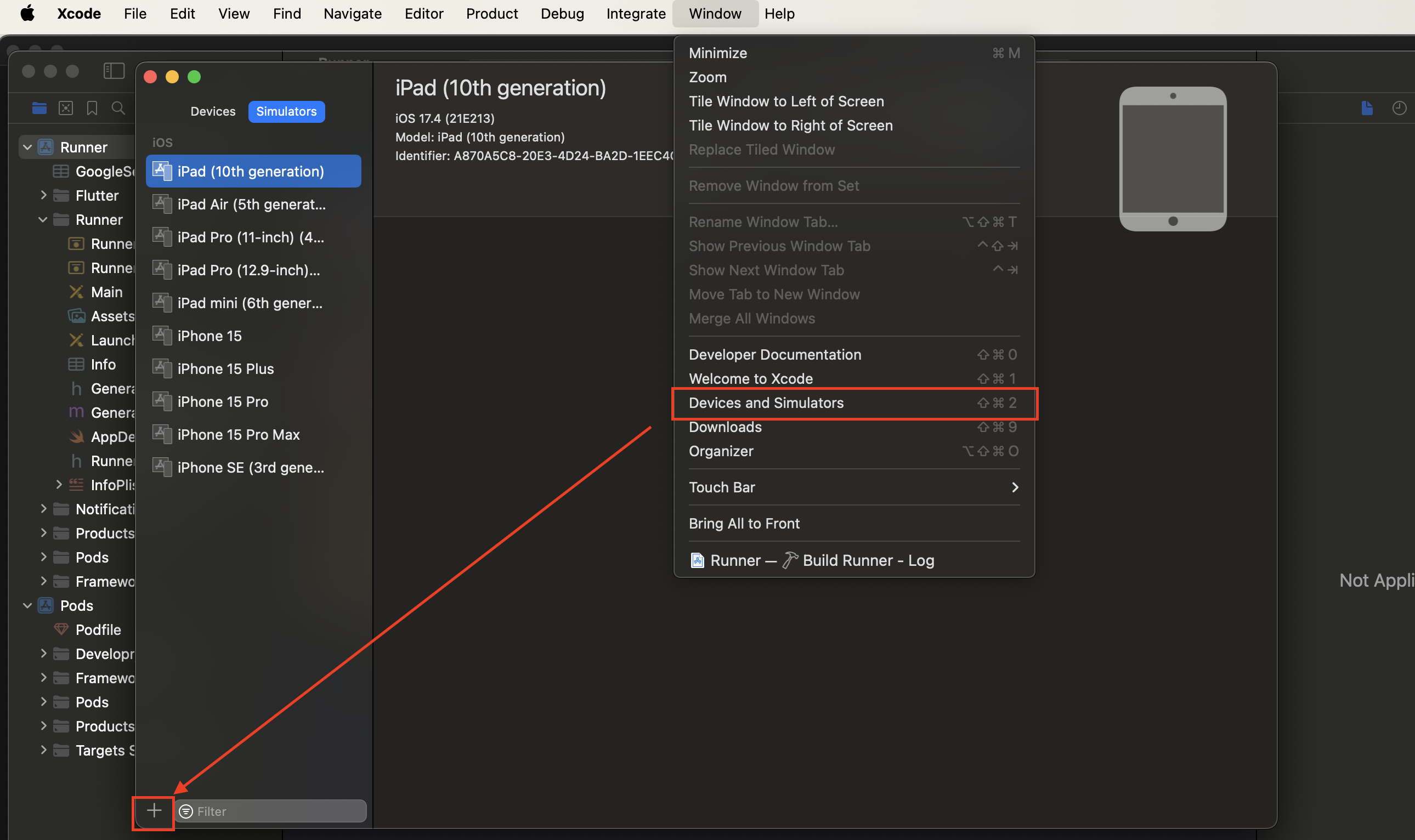 1. Window - Devices and Simulators 클릭 후 하단 + 버튼을 클릭합니다.