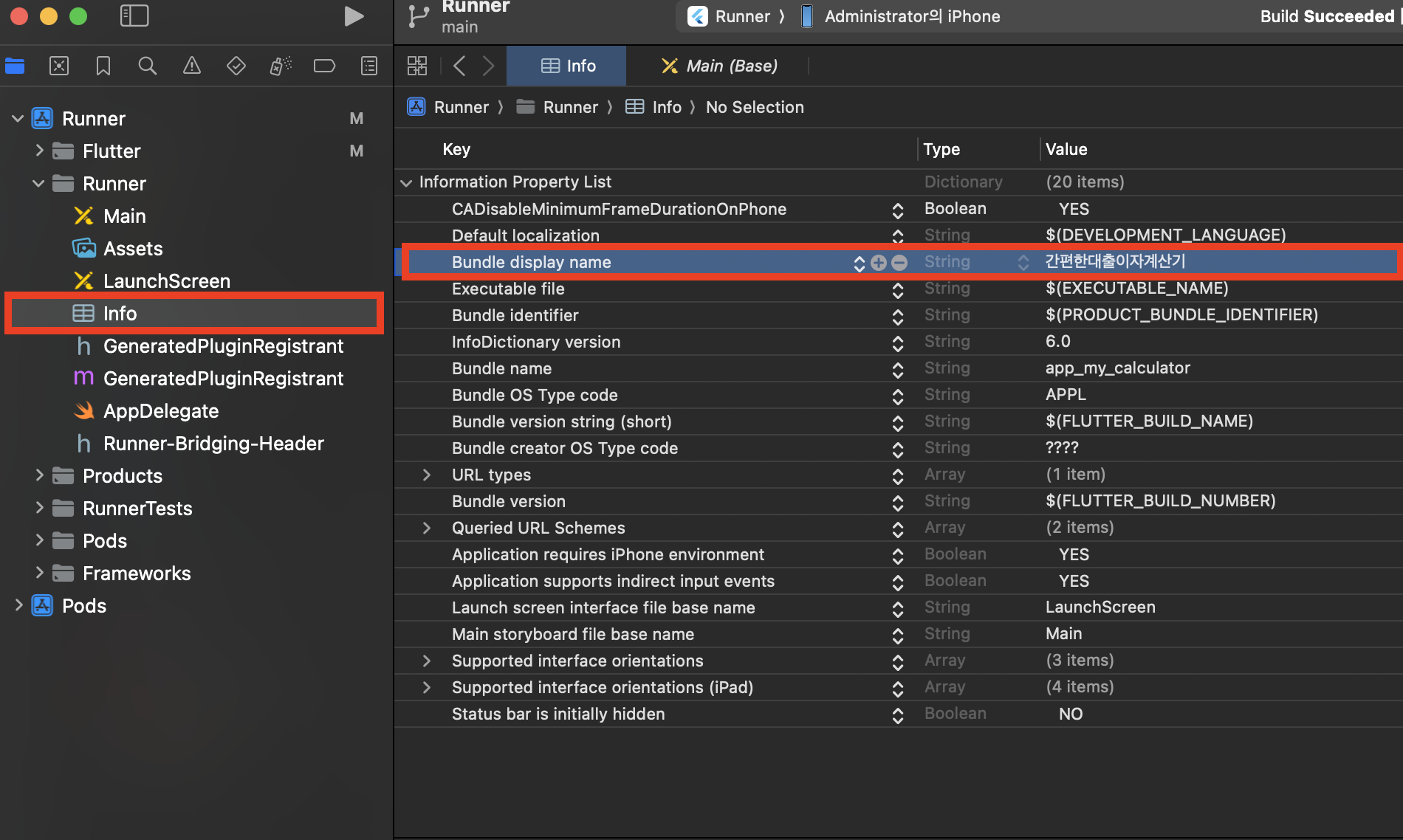 Xcode를 실행하고 Info에 Bundle display name에 앱 이름을 입력합니다.