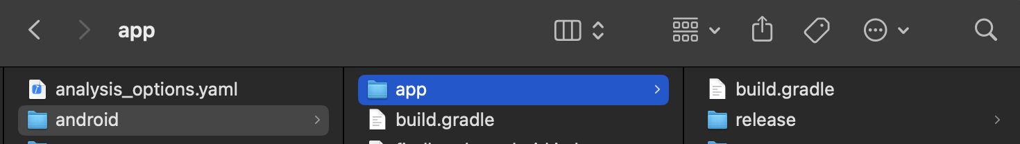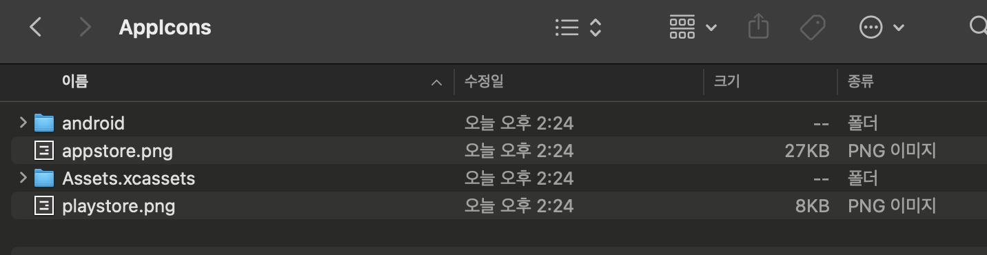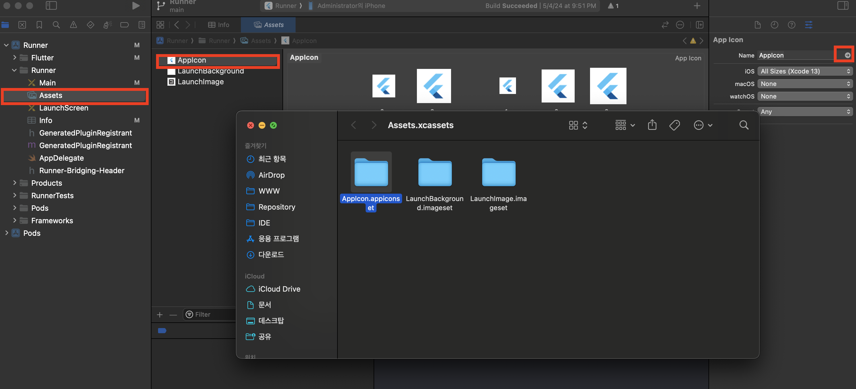 Runner - Assets의 AppIcon을 클릭합니다. 우측에 화살표 표시를 클릭하면 해당 파일이 존재하는 디렉토리가 파인더로 열립니다.