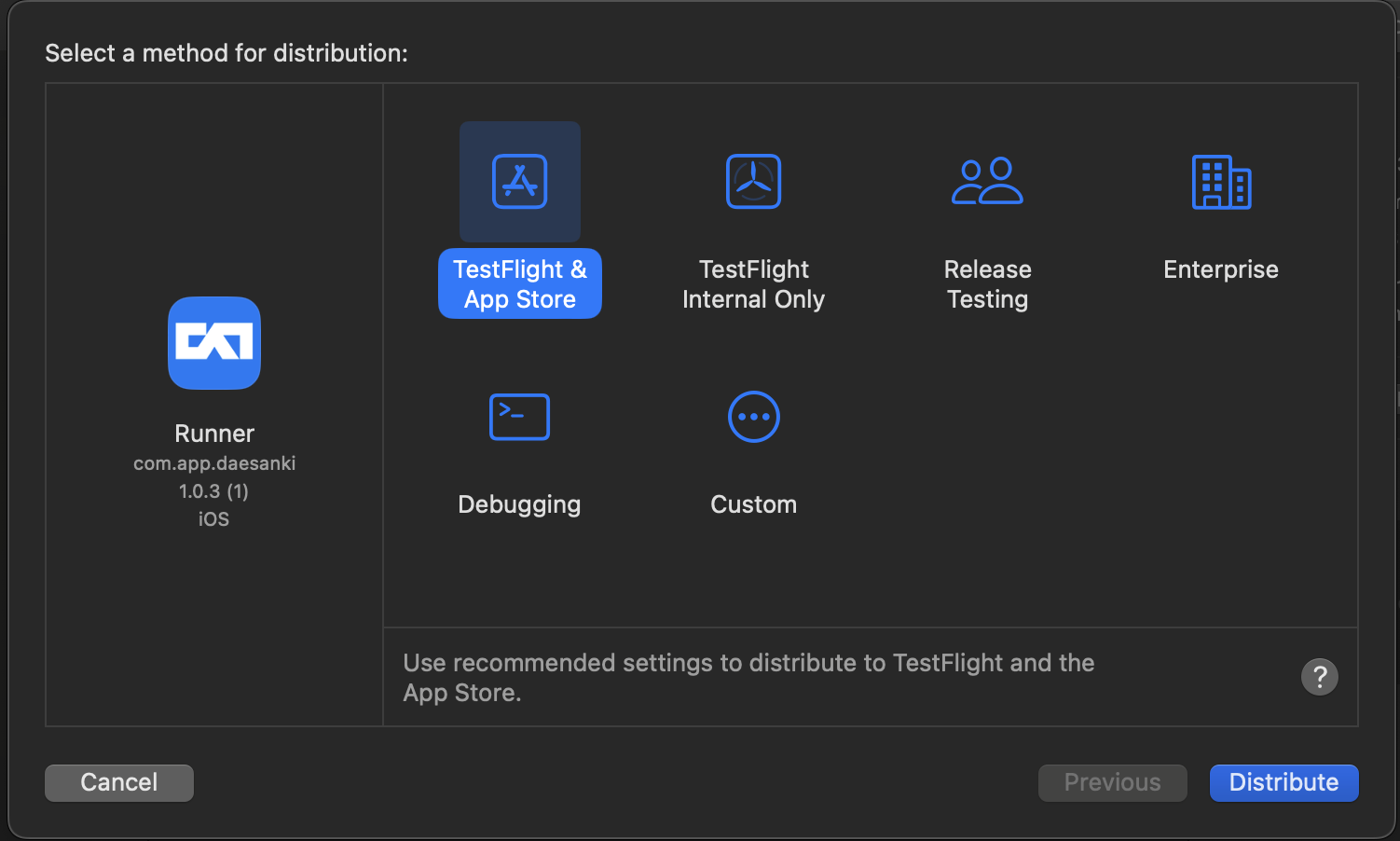 TestFlight & App Store를 선택하고 Distribute를 실행합니다.