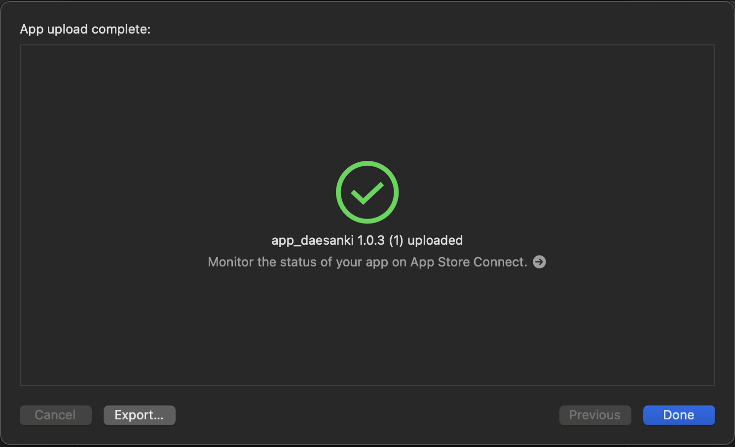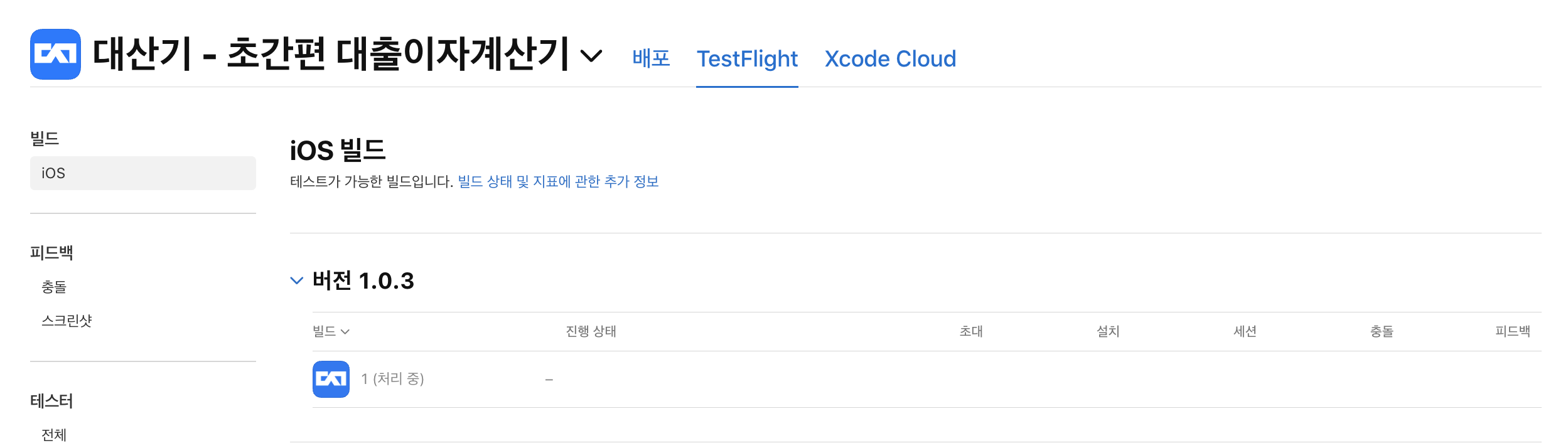 업로드가 성공되면 앱스토어 커넥트 TestFlight에서 확인할 수 있습니다.