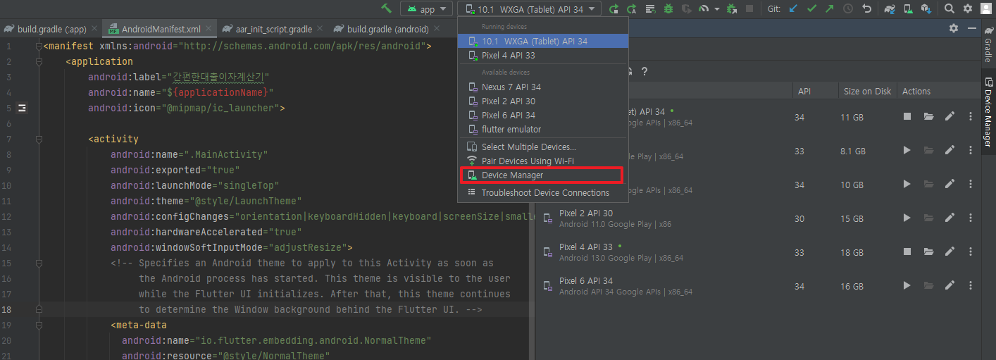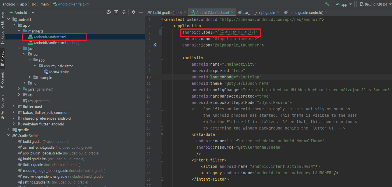안드로이드 스튜디오를 실행하고 AndroidManifest.xml 파일에서 android:label 부분에 이름을 입력합니다.