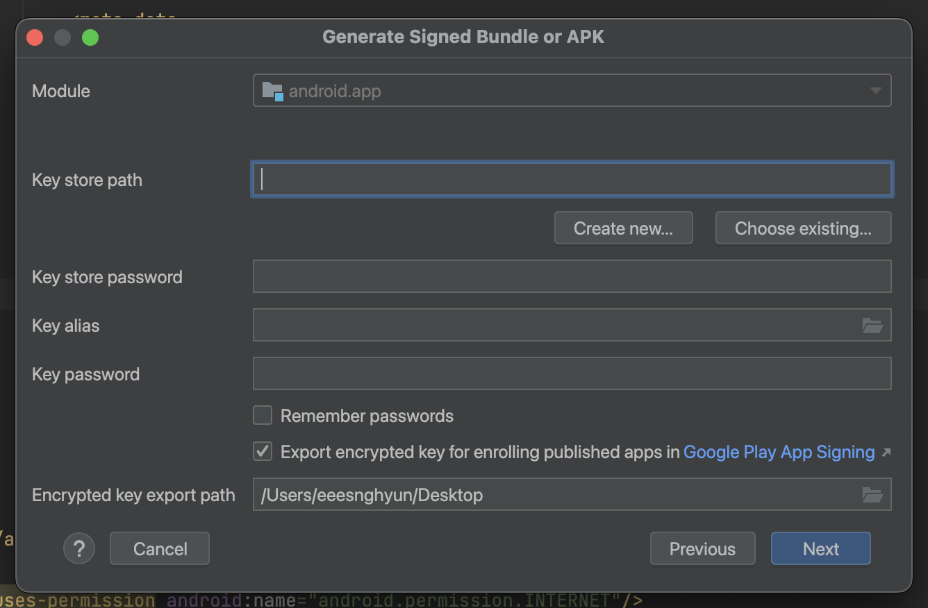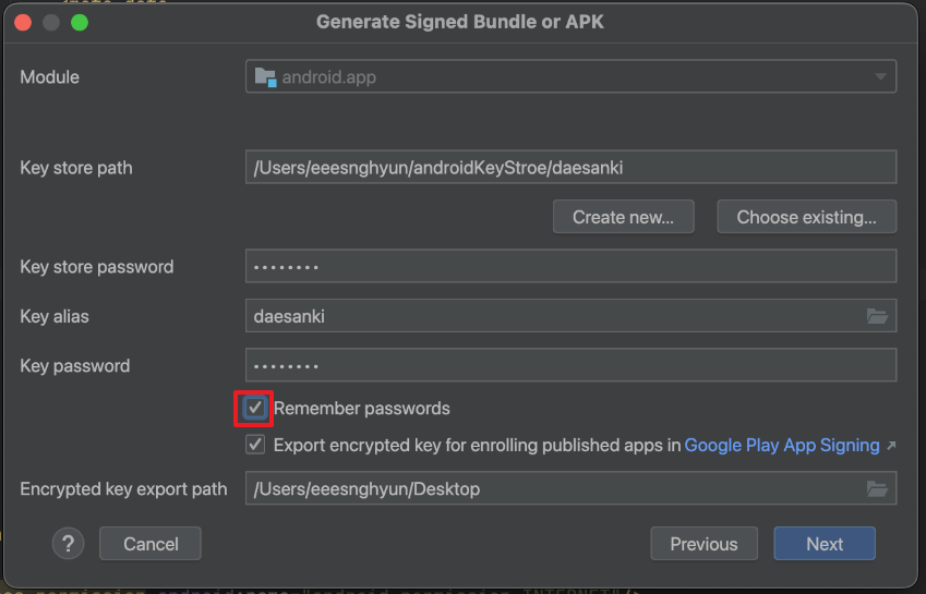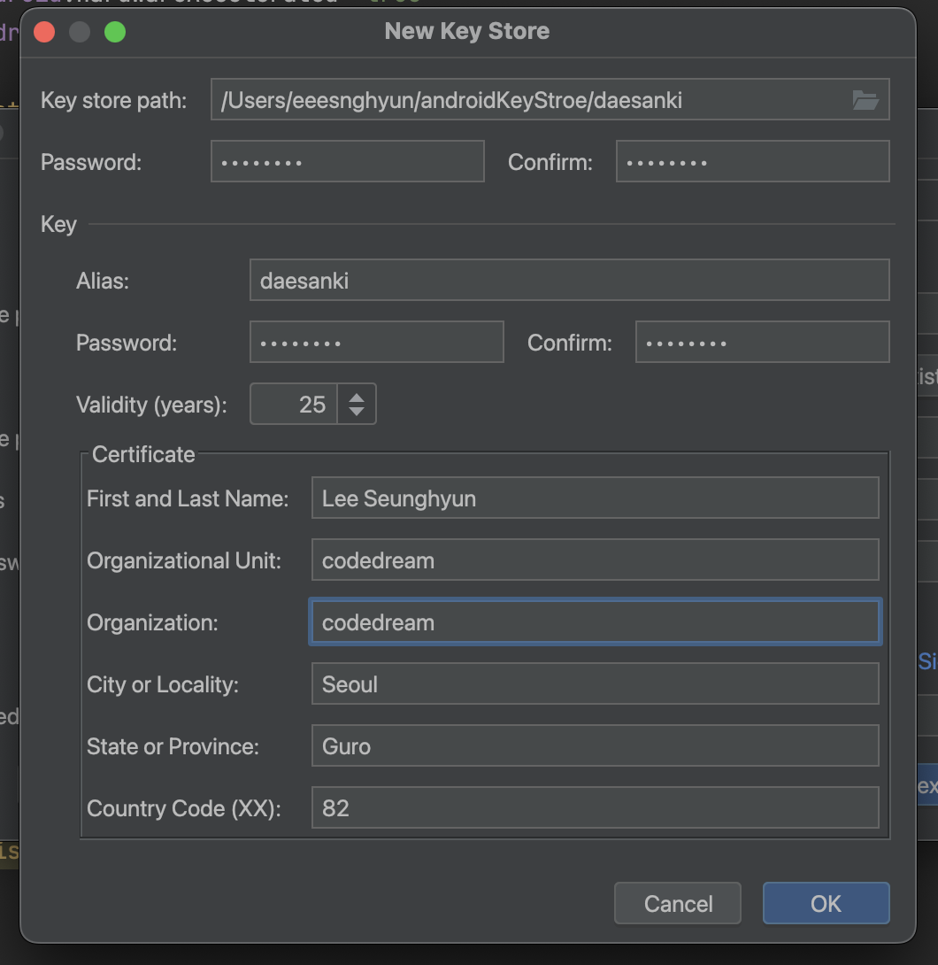 - Key store path : 키스토어 경로를 지정 후 파일 이름에 프로젝트명을 입력합니다. → /Users/eeesnghyun/androidKeyStore/daesanki