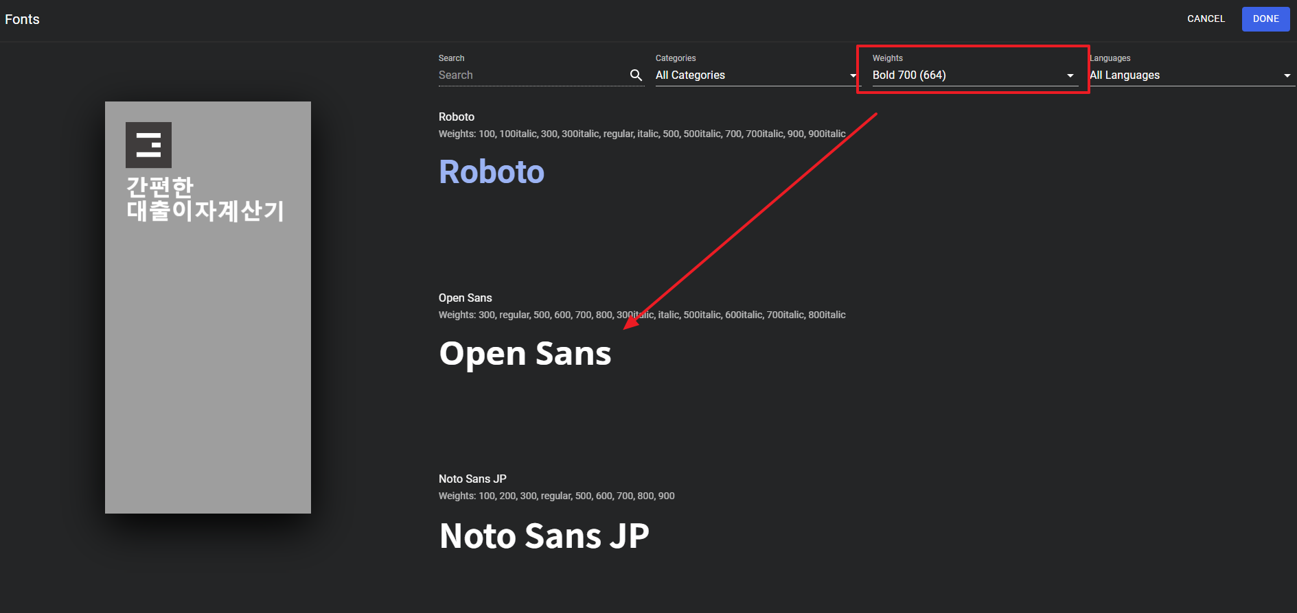 Title, Subtitle의 Family를 클릭해 폰트를 선택할 수 있습니다.