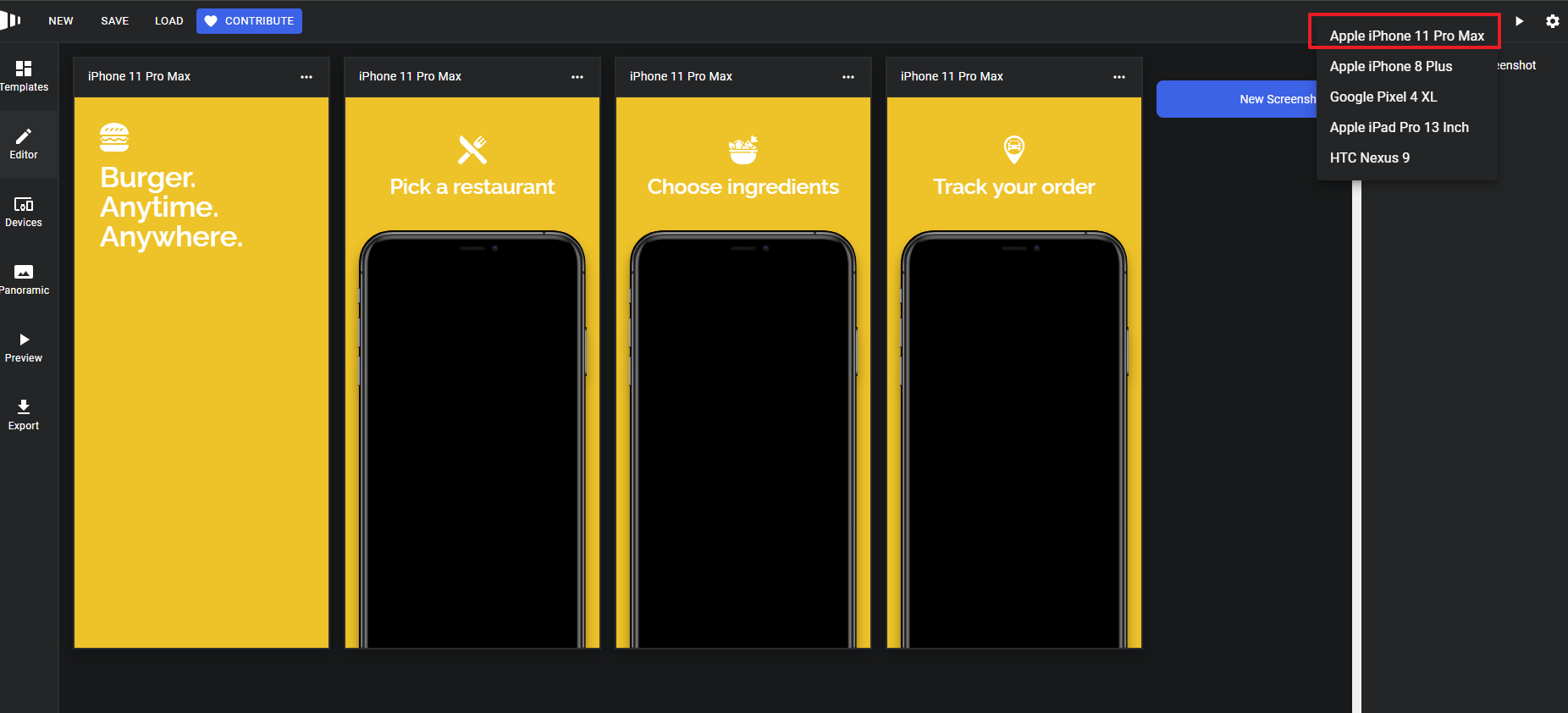 스크린샷에 필요한 디바이스를 정리하면 Android는 Pixel 4 XL(Pixel 4도 가능), 10.1 WXGA(Nexus 9) 이며 iOS는 iPhone 8 Plus, iPhone 11 Pro Max, iPad Pro 12.9 Inch 입니다.