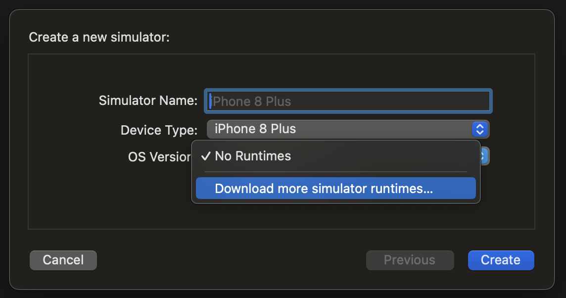3. OS Version이 No Runtimes로 나와있다면 선택할 수 있는 OS가 없다는 뜻이므로 Download more simulator runtimes... 를 클릭합니다.