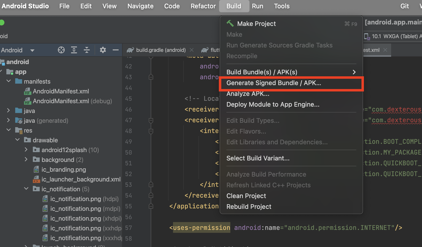 빌드를 위해 상단에 Build - Generate Signed Bundle / APK... 를 클릭합니다.