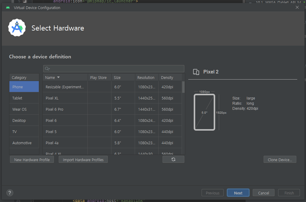 3. Phone - Pixel 4 XL, Tablet - 10.1 WXGA 디바이스 선택 후 설치