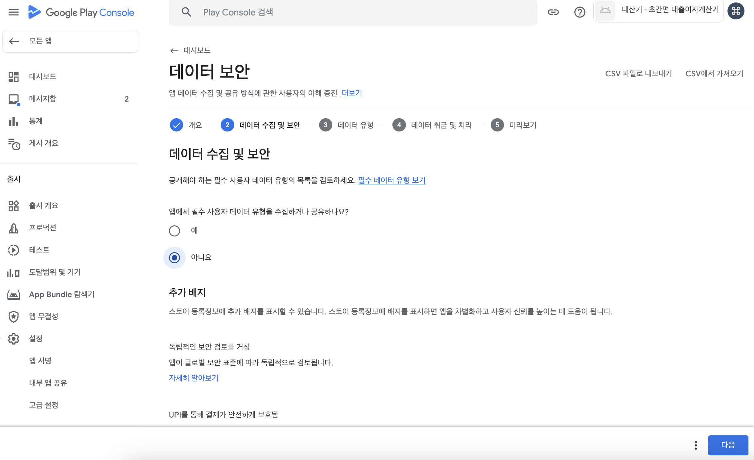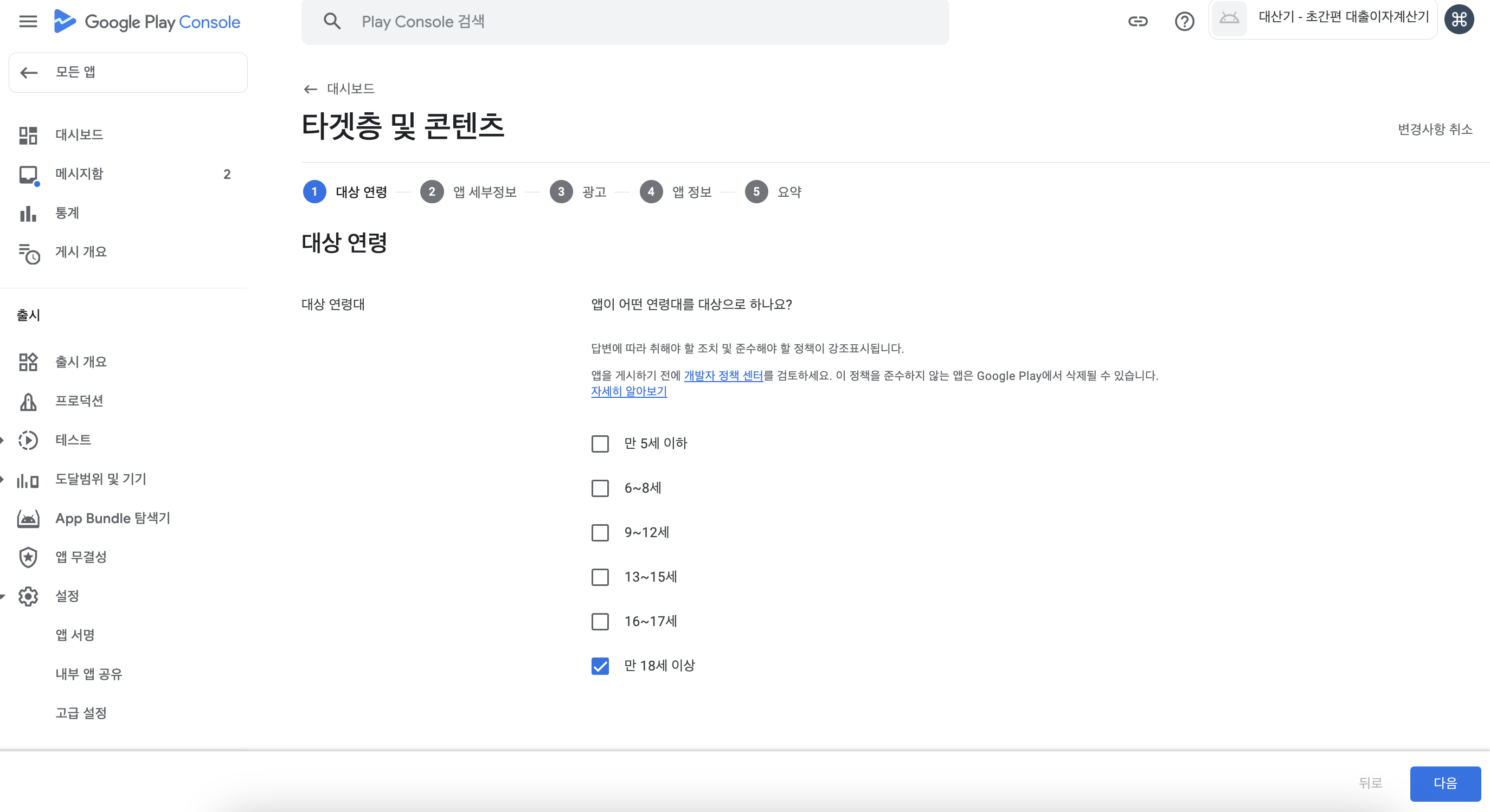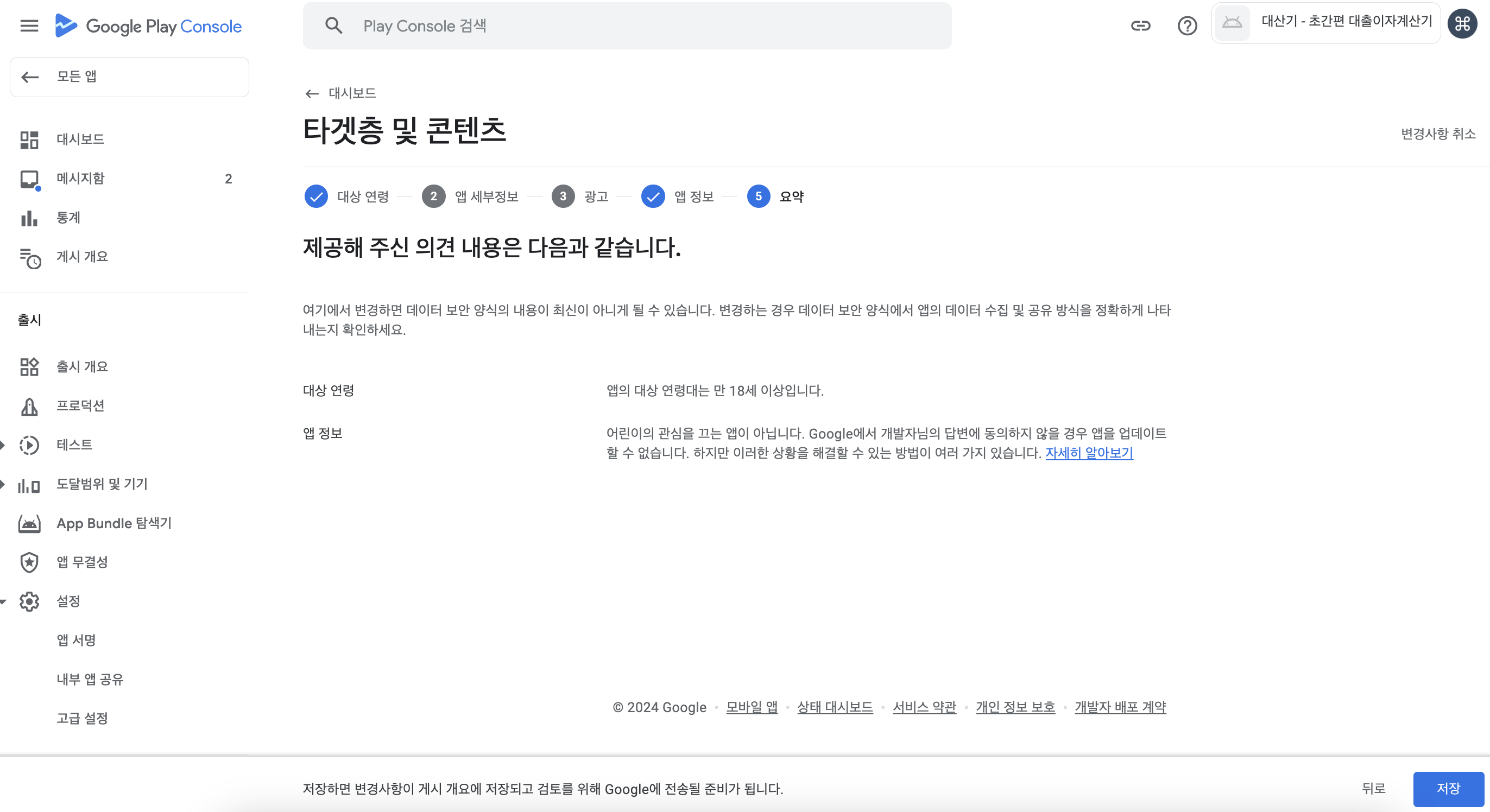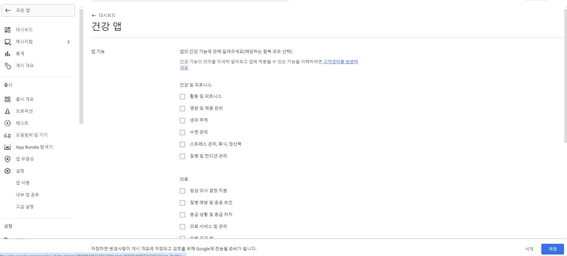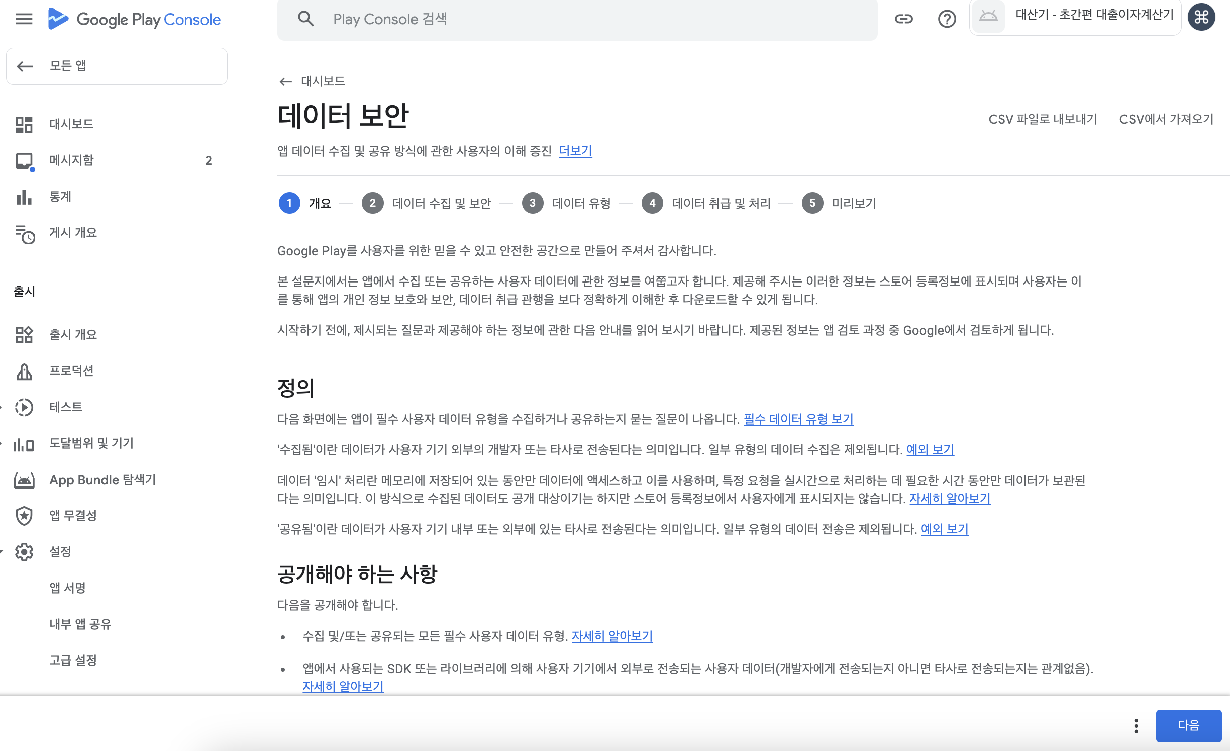 → 개인정보처리방침/앱 액세스 권한/광고/콘텐츠 등급/타겟층/뉴스 앱/데이터 보안/정부 앱/금융 기능/건강