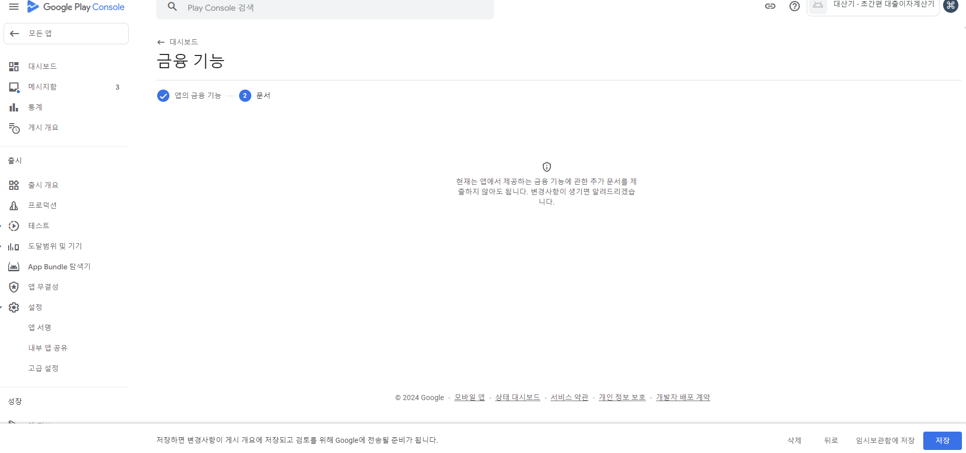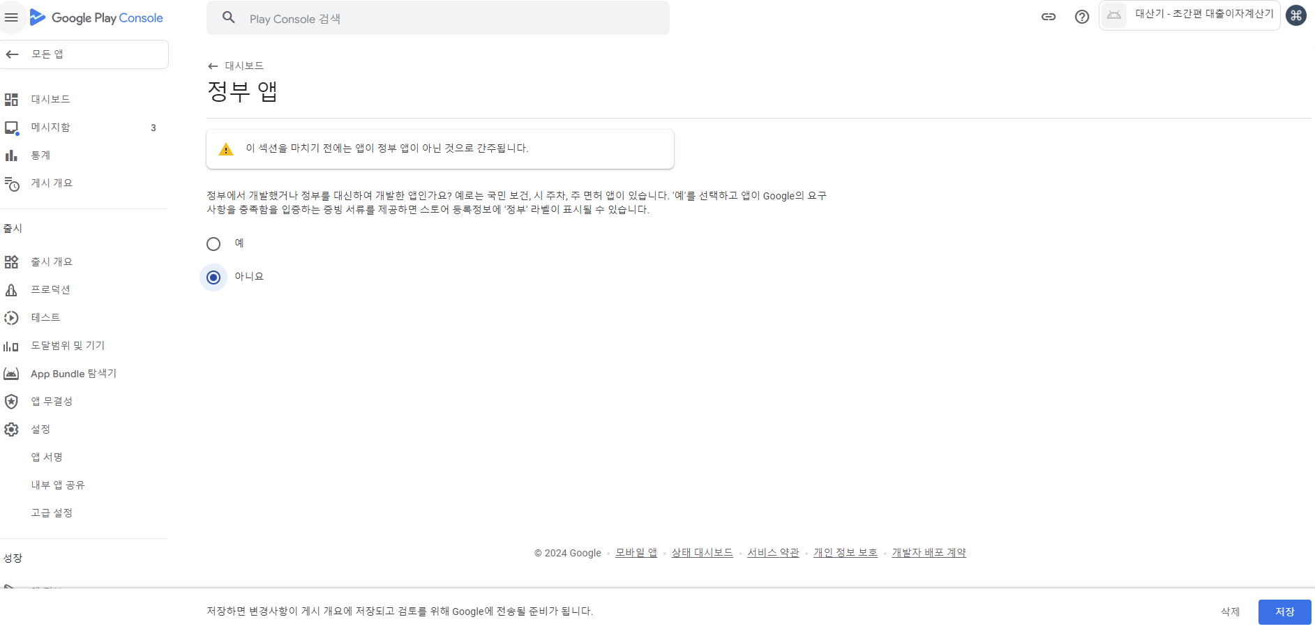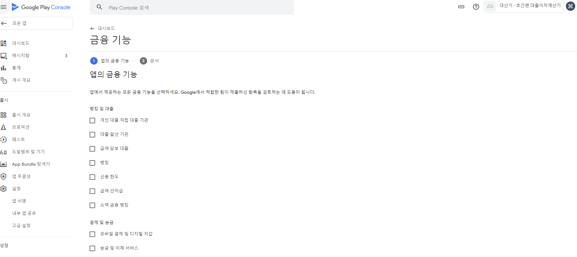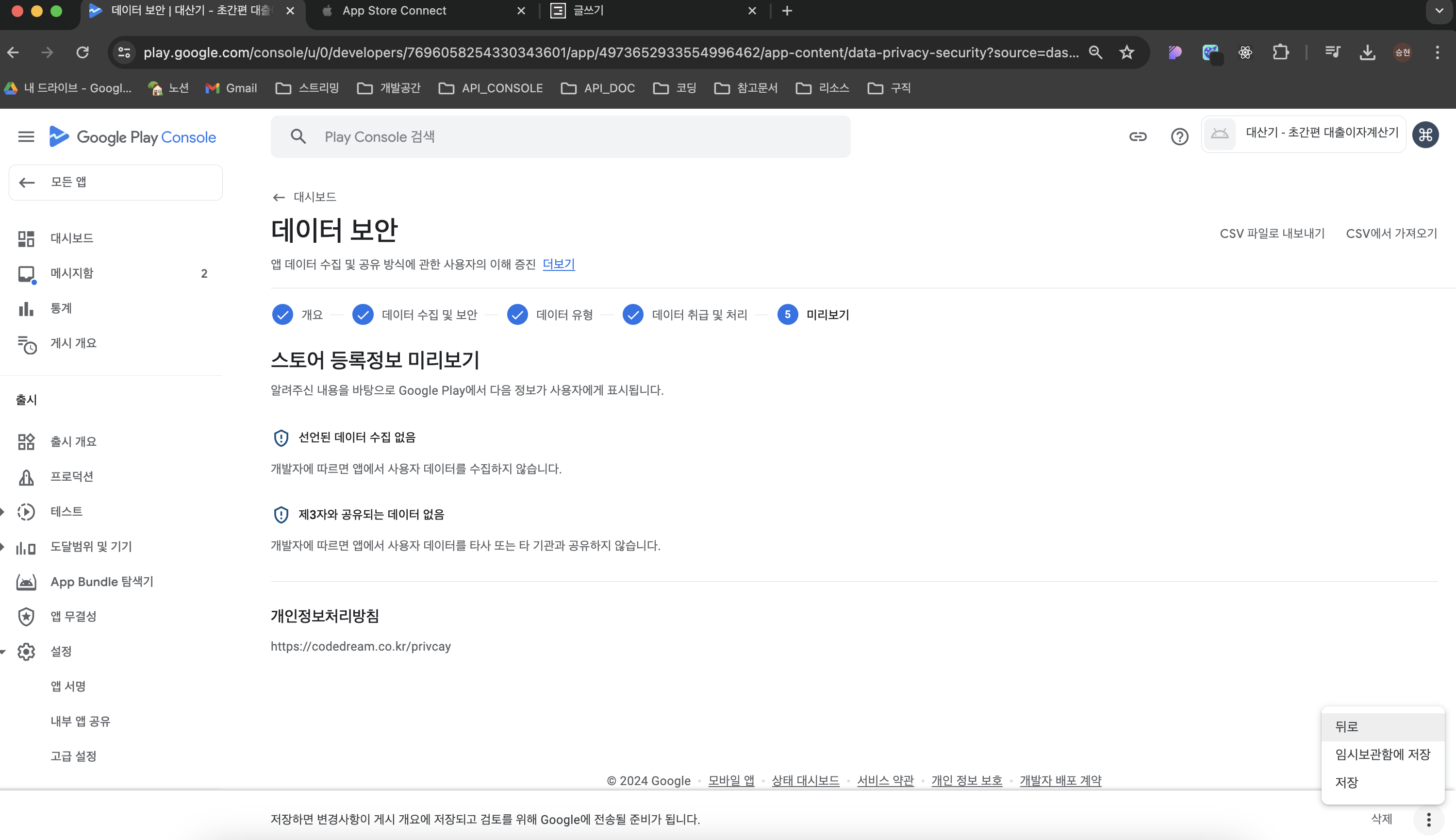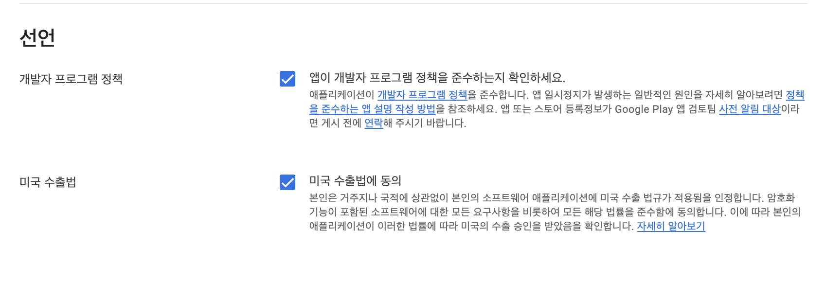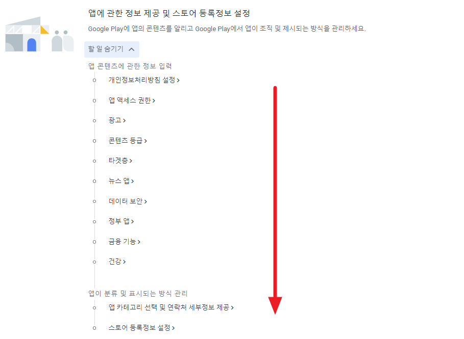 → 개인정보처리방침/앱 액세스 권한/광고/콘텐츠 등급/타겟층/뉴스 앱/데이터 보안/정부 앱/금융 기능/건강