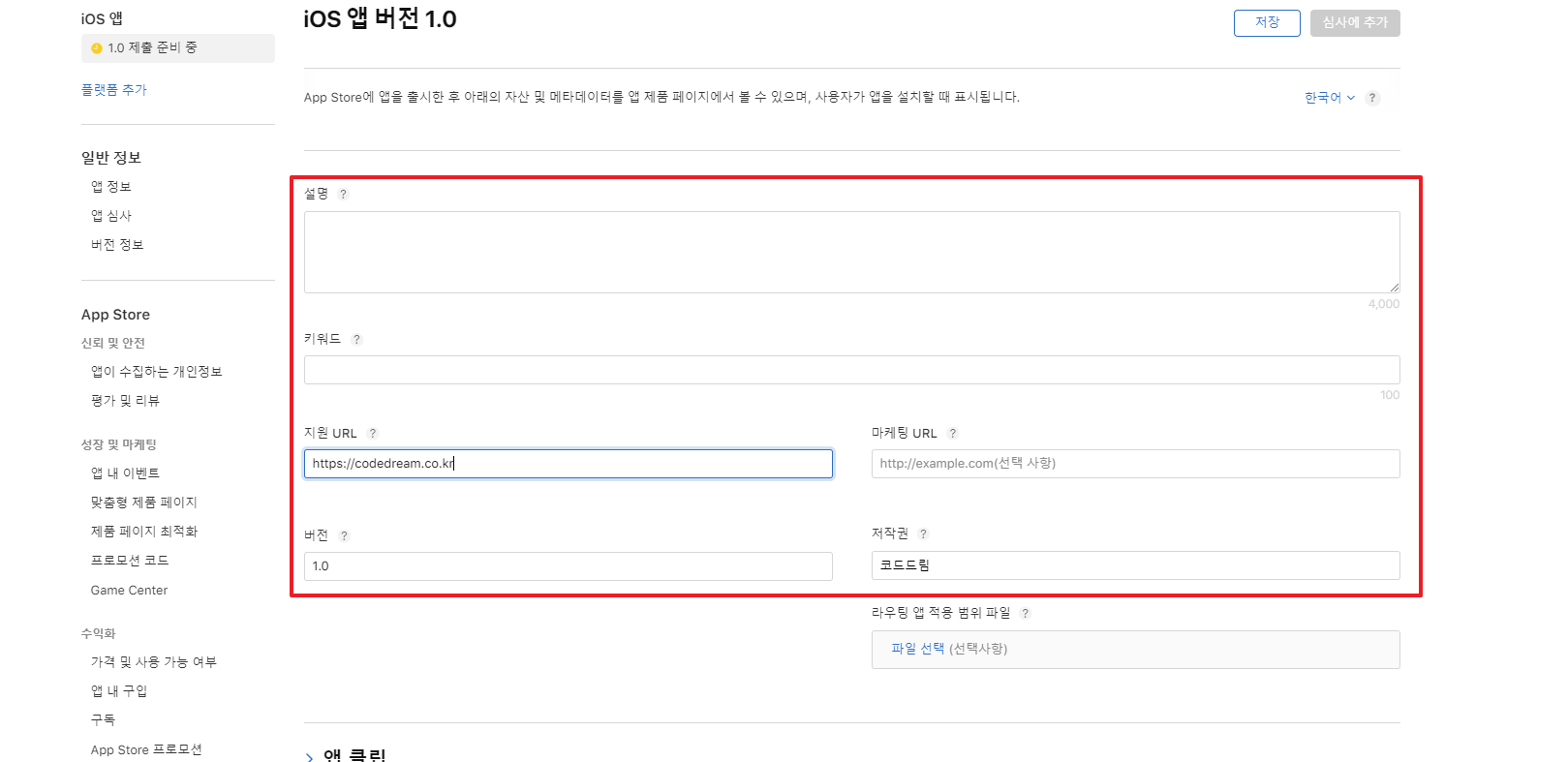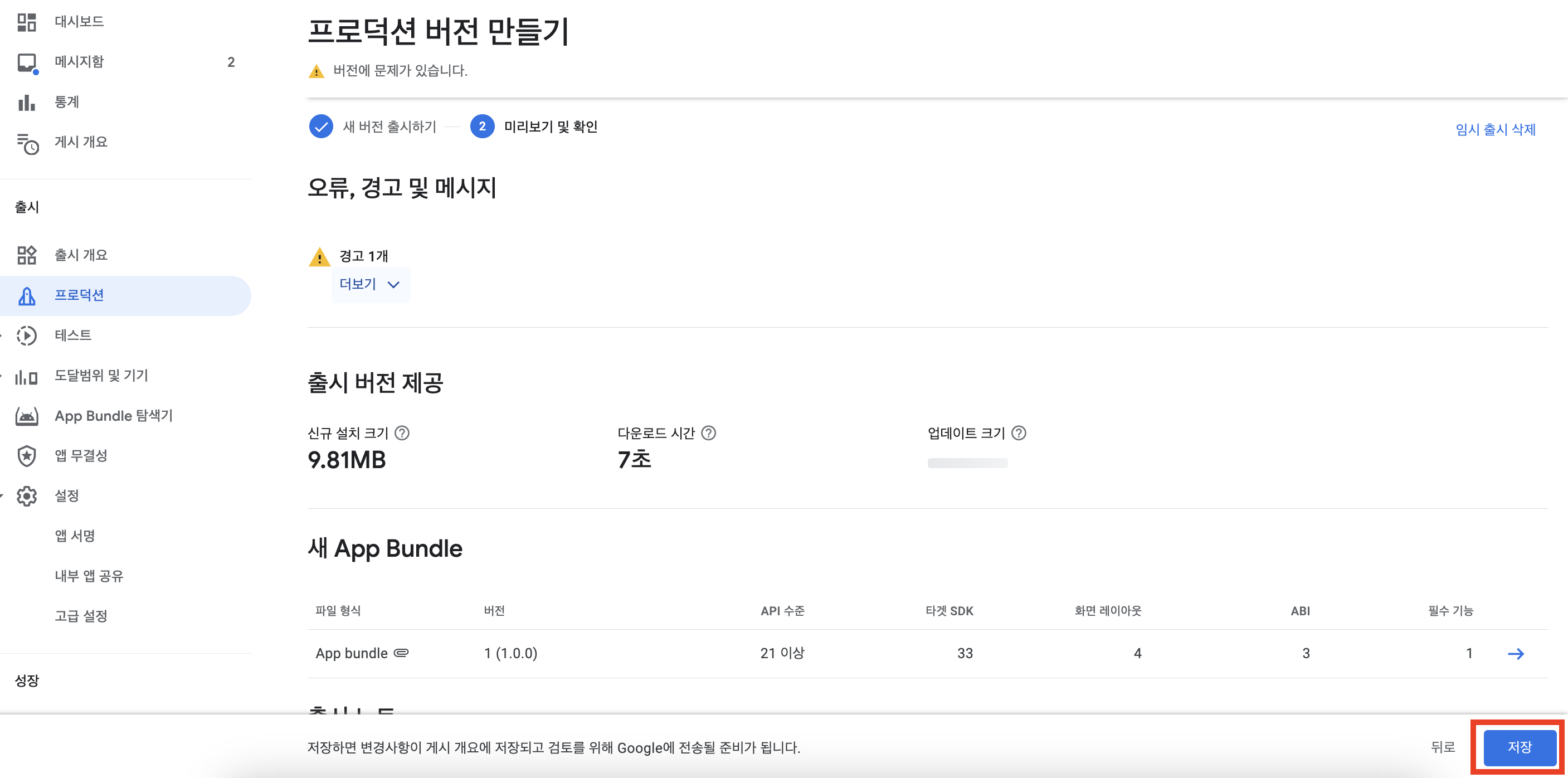 스토어에 소개될 앱 설명과 스크린샷을 저장합니다. 모든 정보 입력을 마친 후에는 상단에 저장버튼을 클릭합니다.