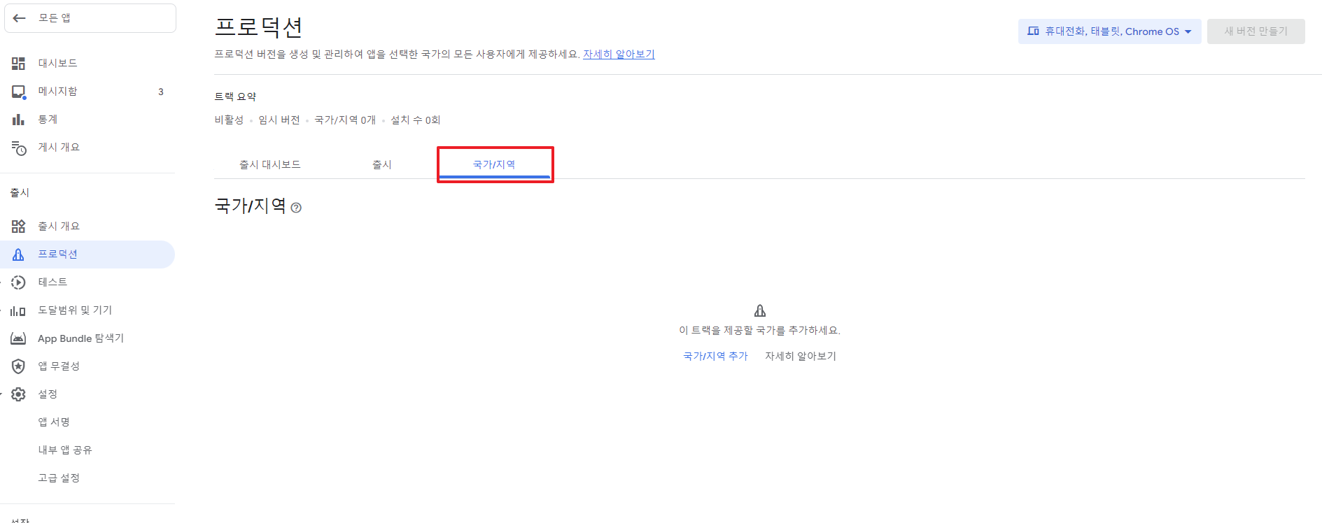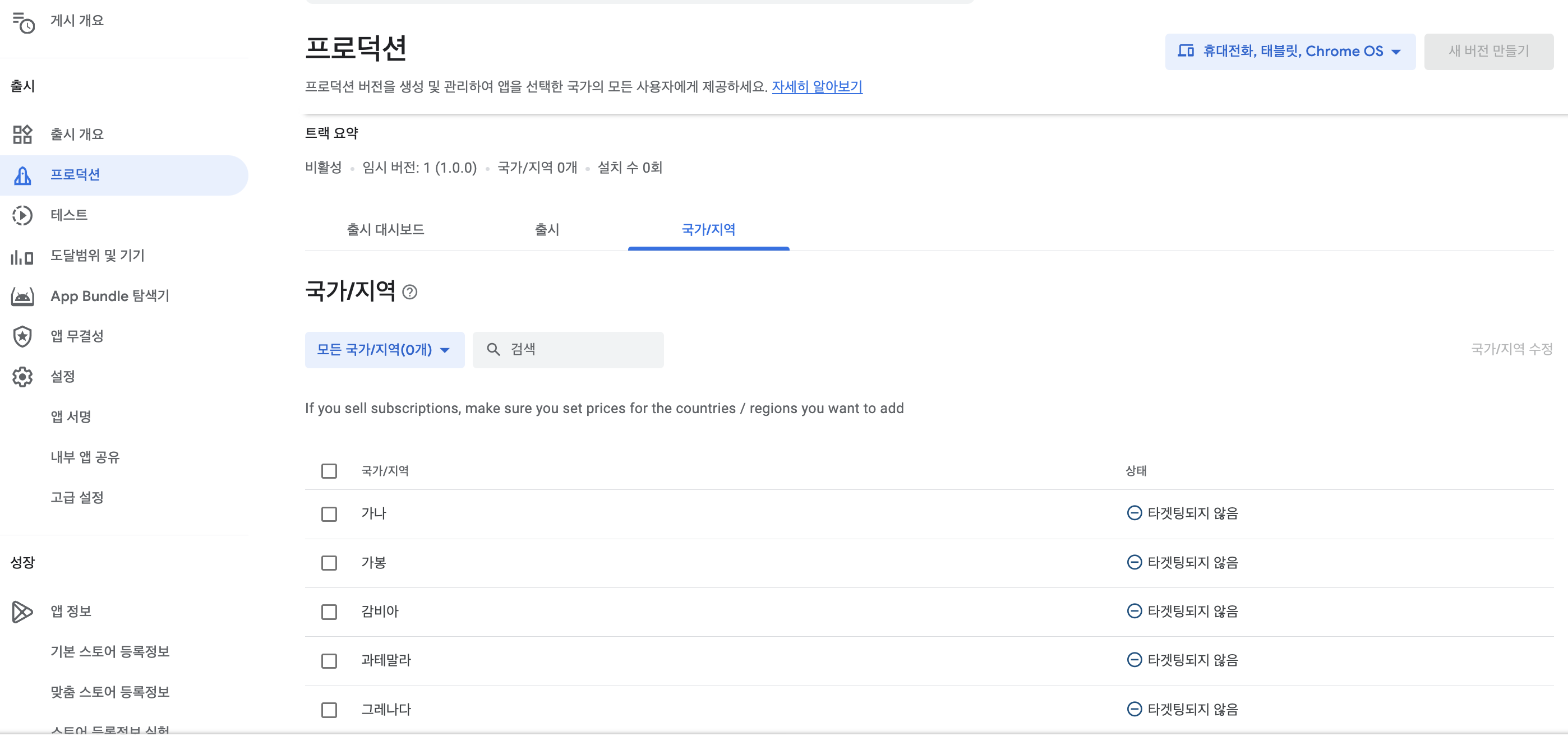 스토어 등록에 필요한 정보는 모두 입력을 마쳤습니다. 프로덕션 메뉴를 클릭해 국가/지역을 선택합니다.