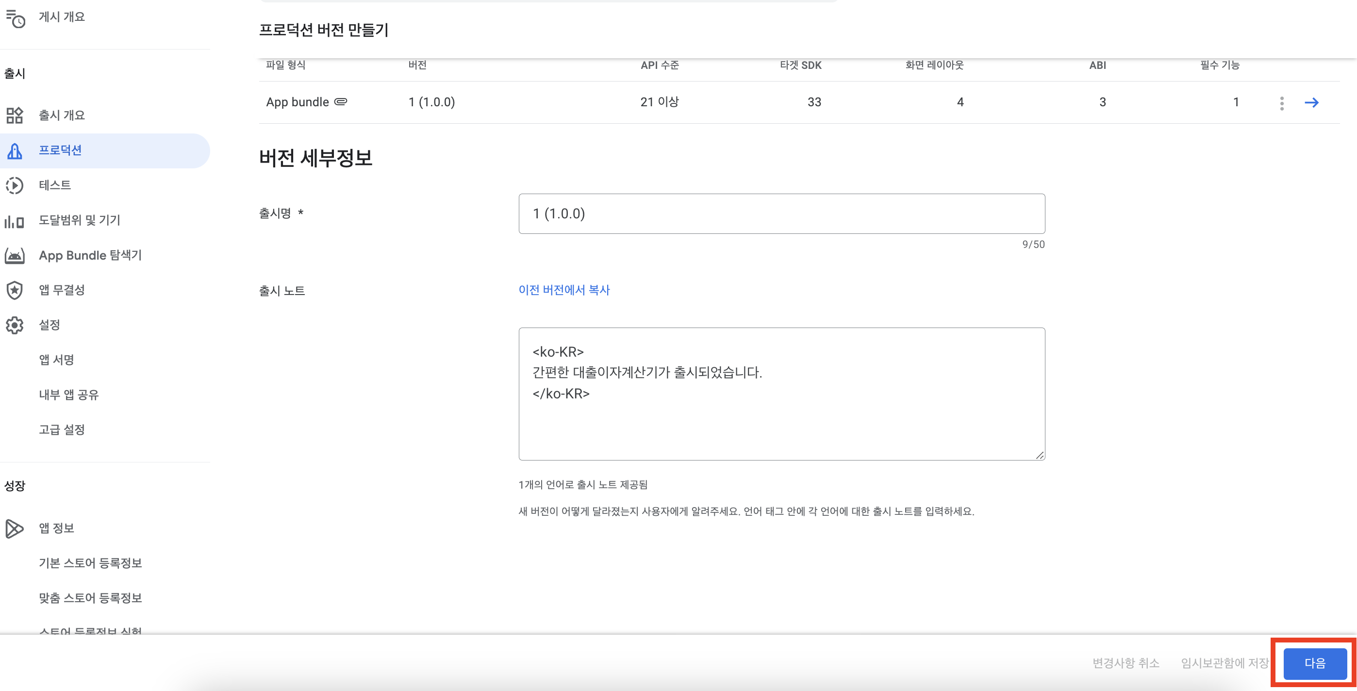 출시 노트 ko-KR 태그 안에 간략한 정보를 추가하고 다음을 클릭합니다.