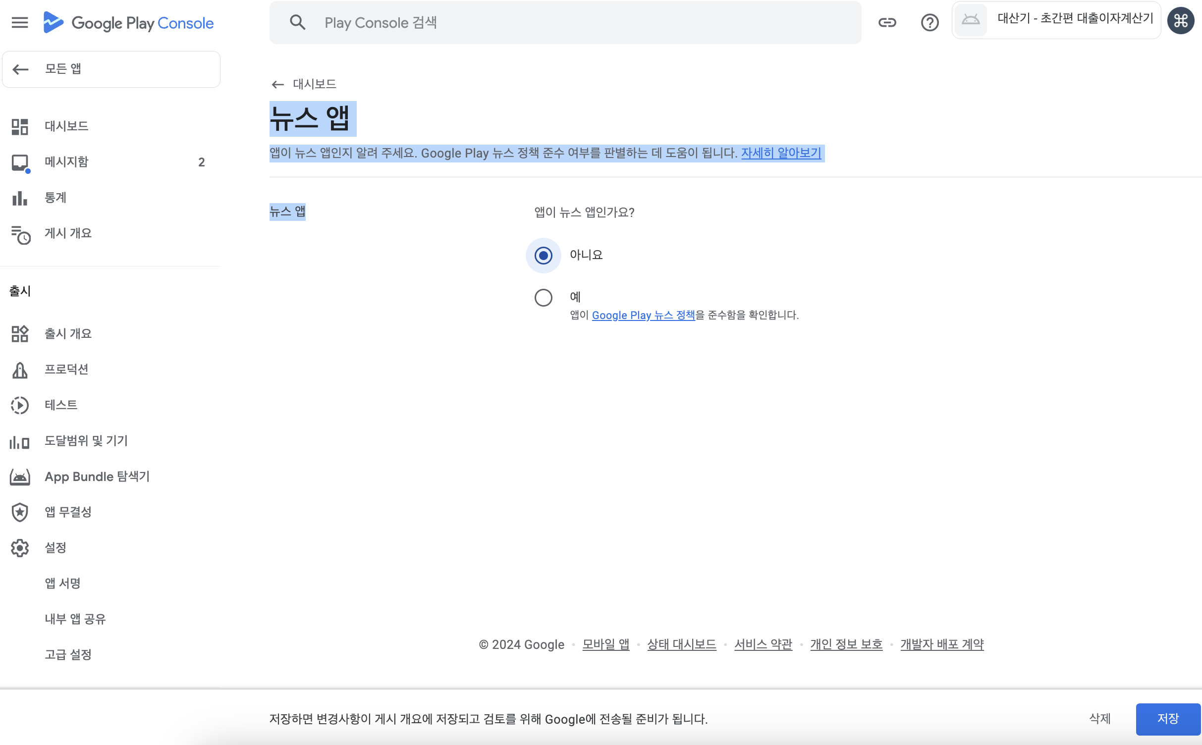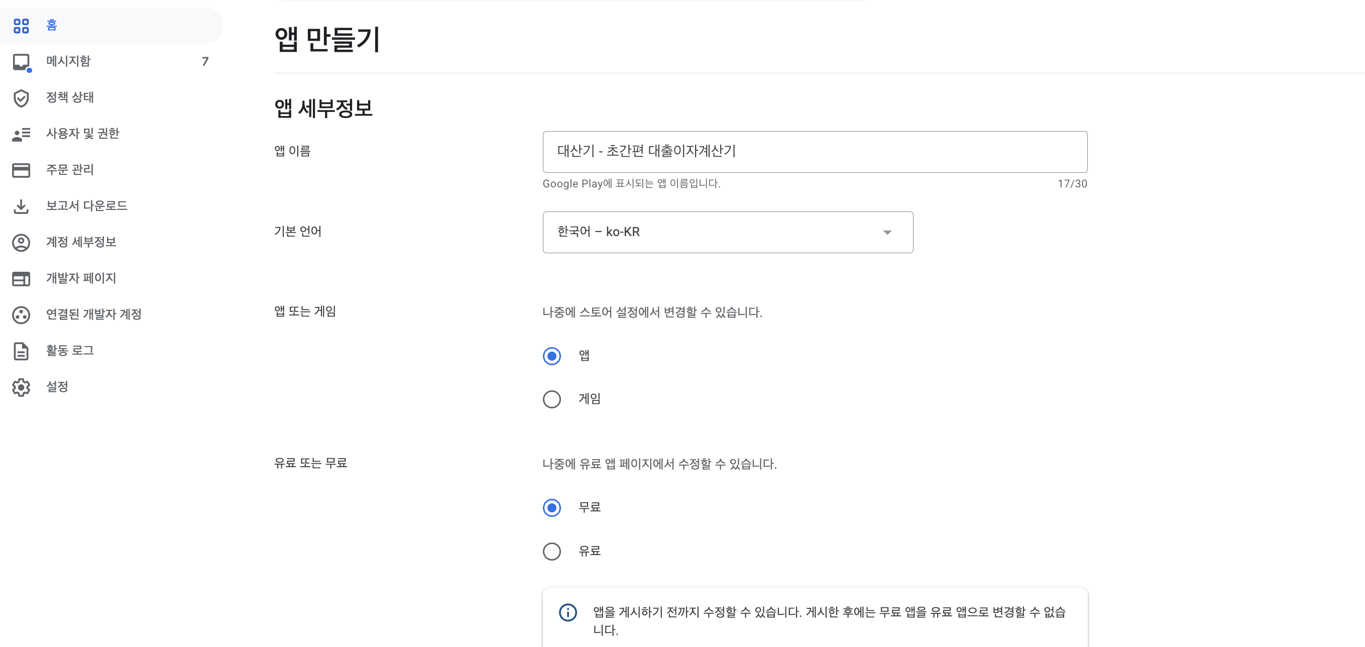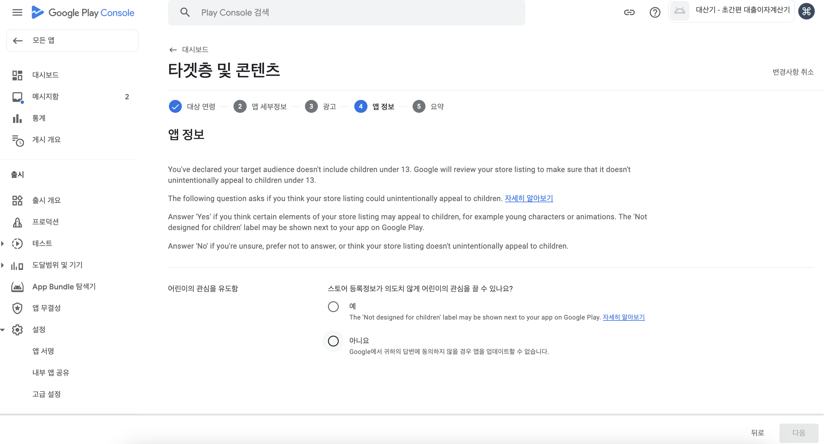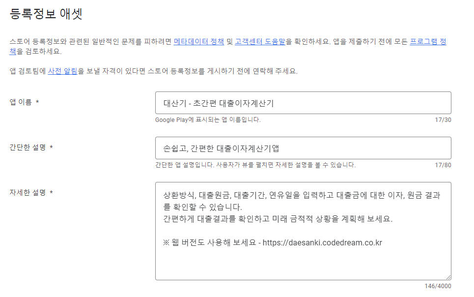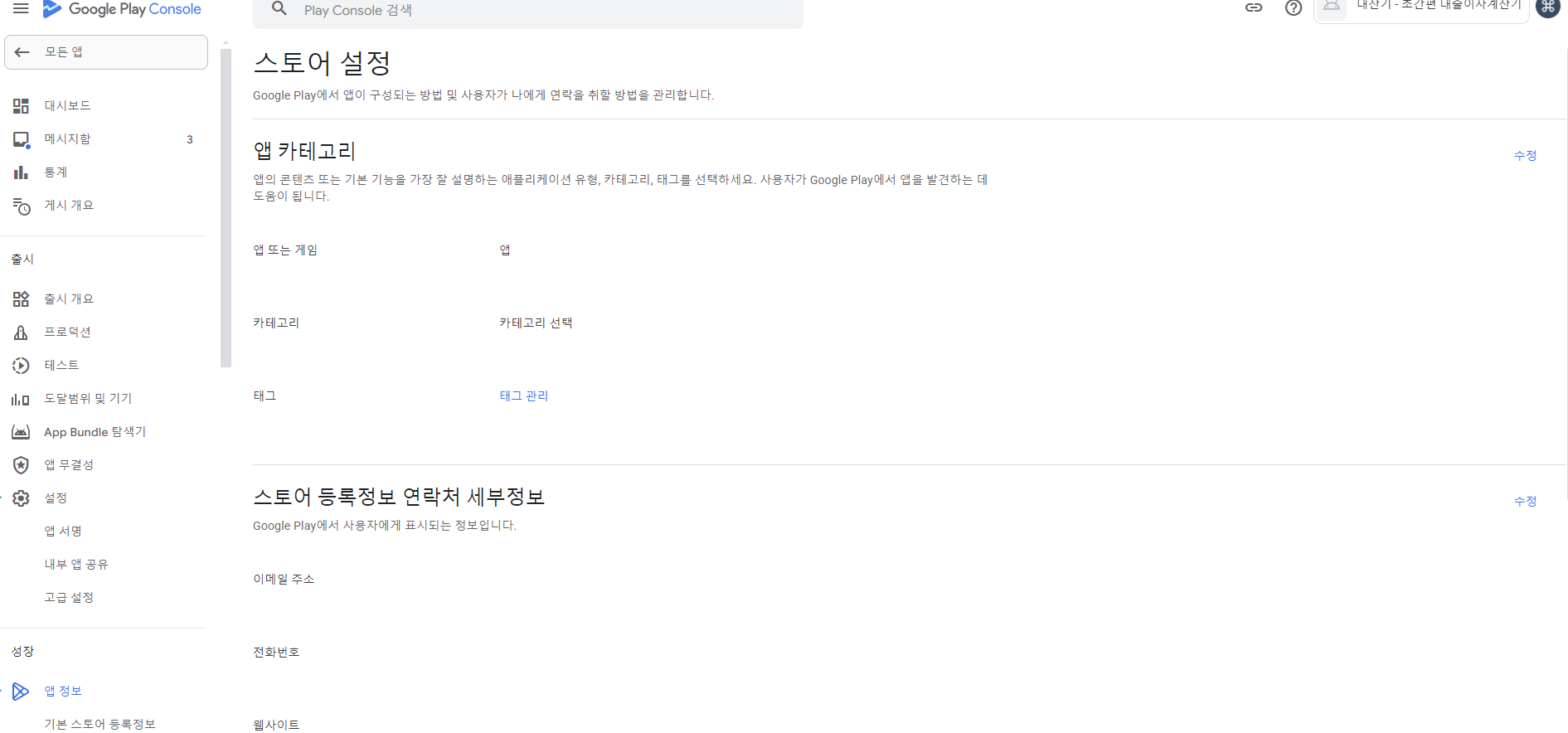 - 스토어에 앱 정보 입력, 스토어에서 요구하는 여러가지 정보들을 기입해야 합니다.(개인정보처리방침, 앱 소개, 광고여부 등)