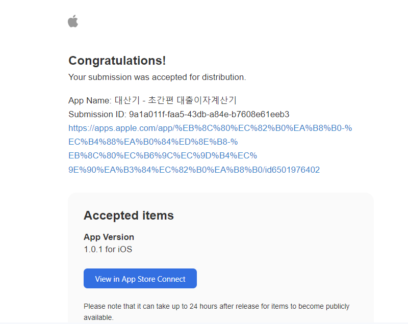 앱스토어 역시 정해진 심사 기간은 없으며, 빠르면 하루(주말 제외)만에 완료가 되기도 합니다.