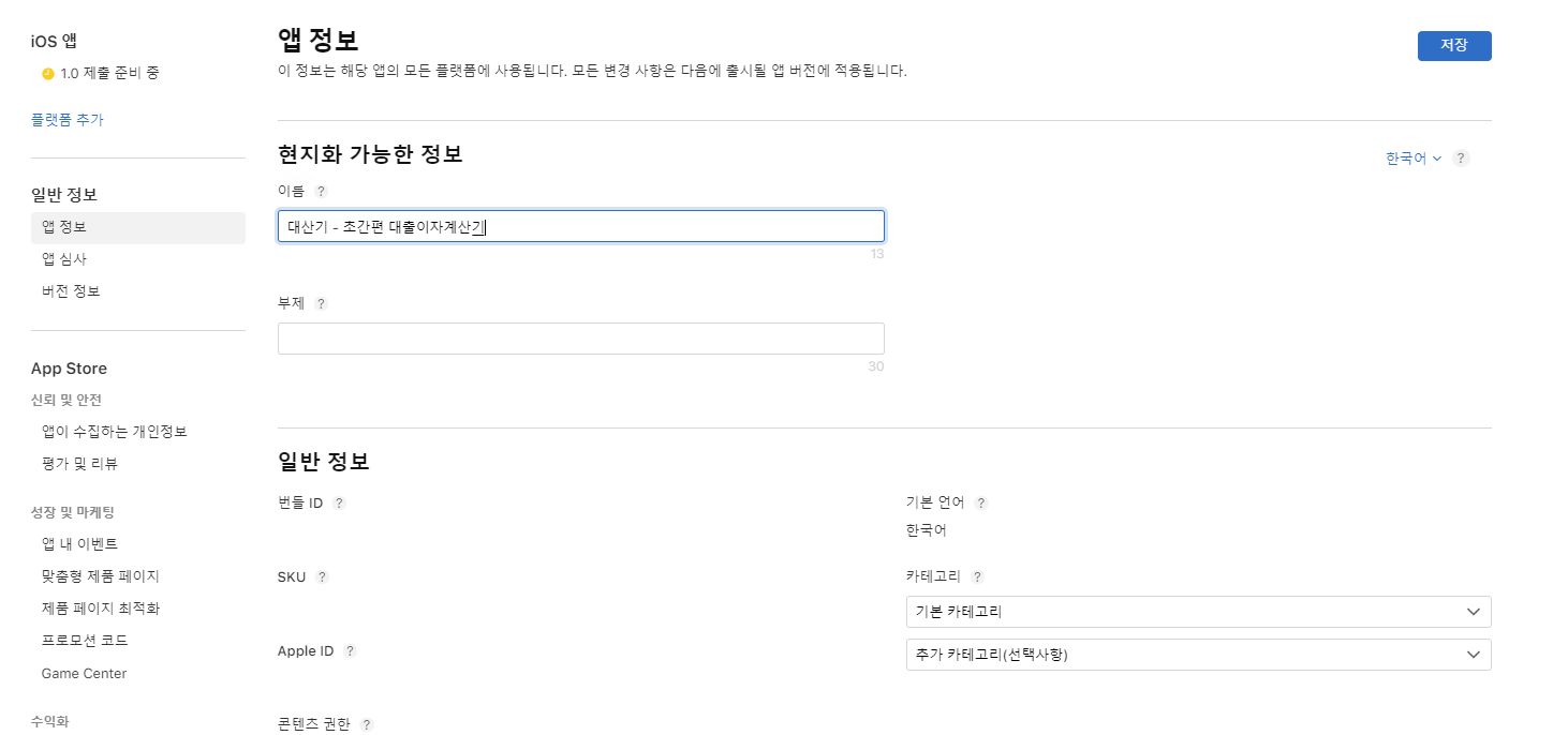 일반 정보 - 앱 정보를 클릭합니다. 앱 정보에 앱 이름과 부제를 입력합니다.