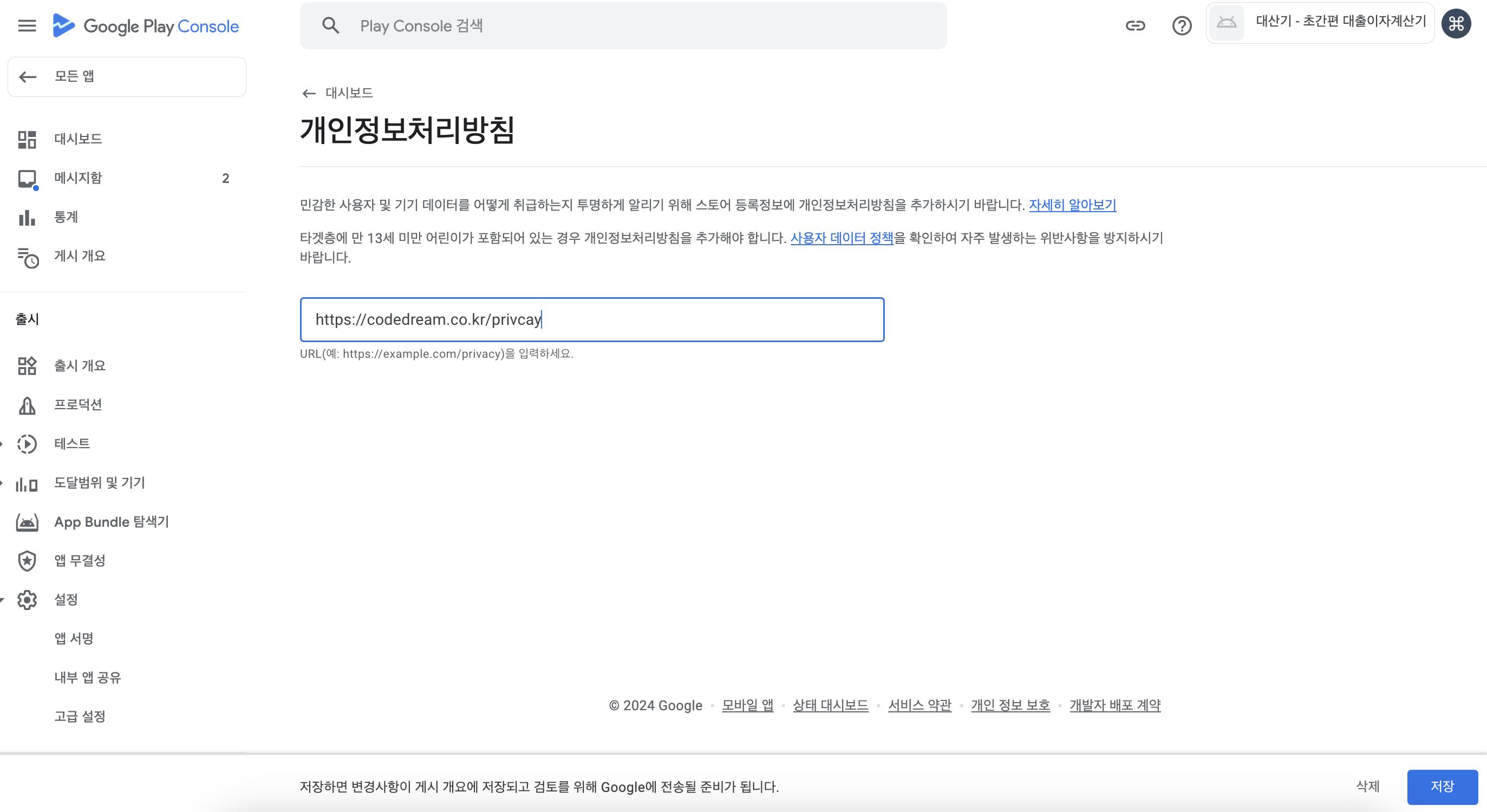 신뢰 및 안전 - 앱이 수집하는 개인정보를 클릭하고 개인정보 처리방침 URL을 등록합니다.