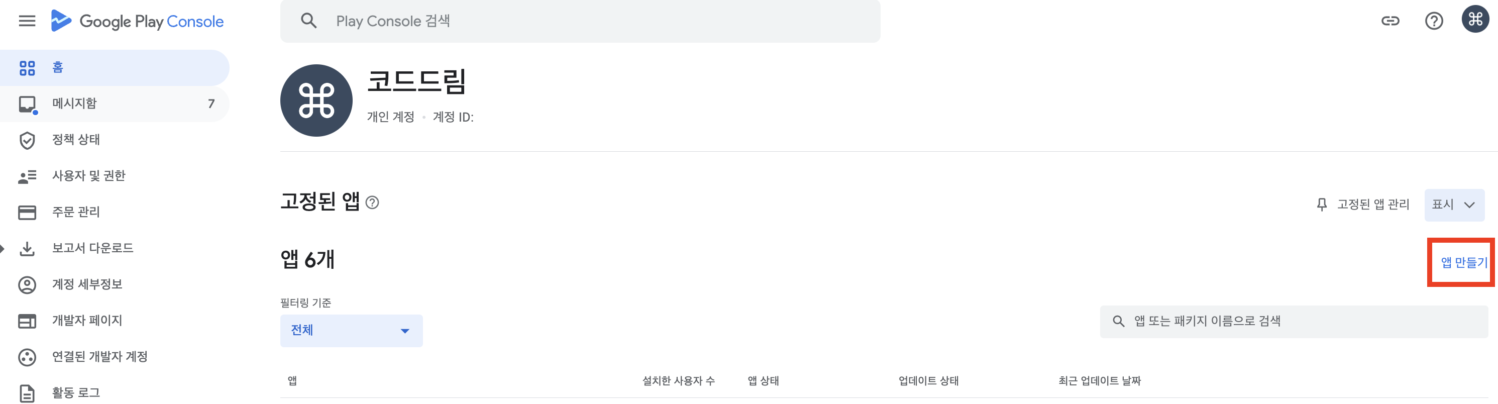 *플레이스토어의 개발자 계정을 미리 만들어 주세요.