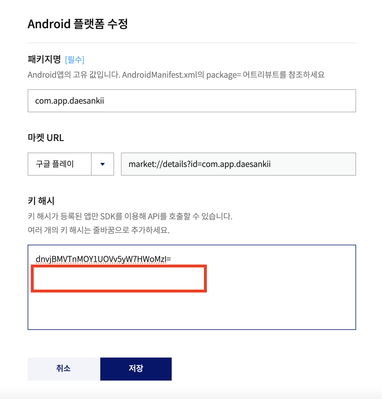 이후 발급된 릴리즈키를 카카오 키 해시에 등록합니다. 캐 해시는 줄바꿈으로 디버그&릴리즈 등록이 가능합니다.