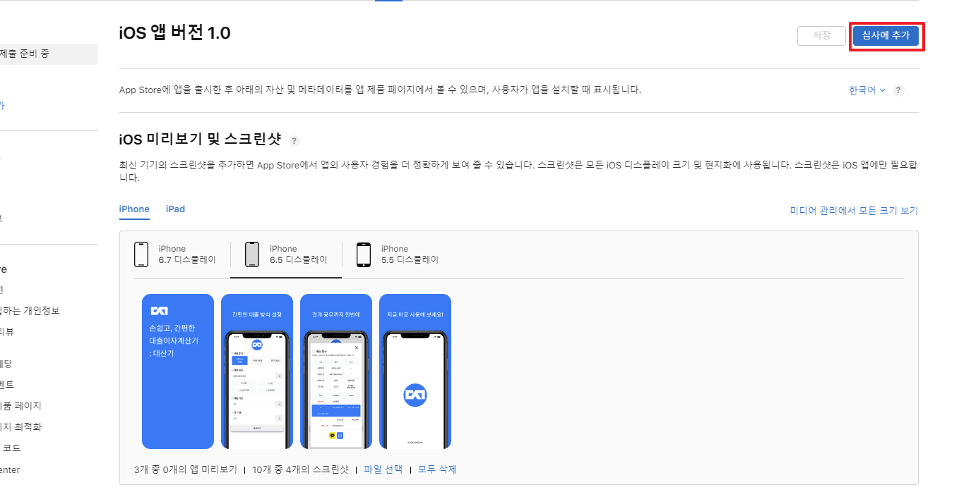 스토어 등록에 필요한 정보는 모두 입력을 마쳤습니다. 초기 화면으로 돌아와 심사에 추가를 클릭합니다.