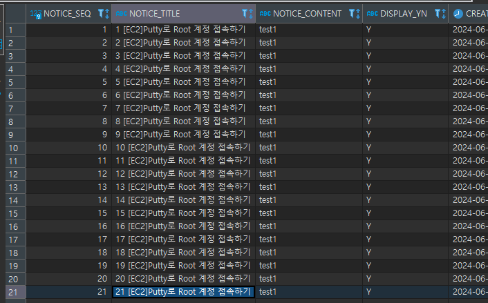최초 공지사항 조회시 마지막 번호(NOTICE_SEQ)가 21로 시작하는 것이 보이며 15개가 조회됩니다.