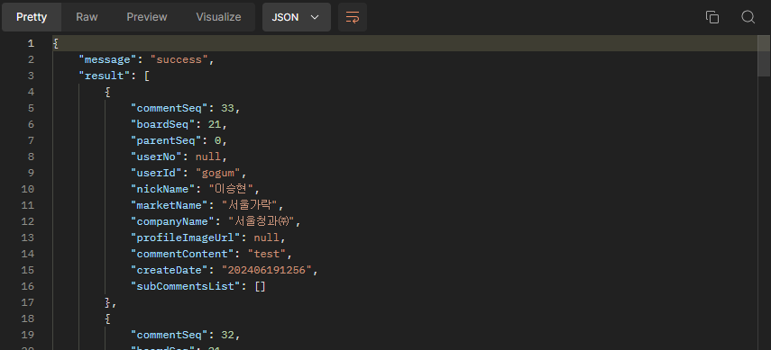 - getCommentsList(Long boardSeq) : 게시글에 댓글 리스트를 조회합니다. buildCommentsList를 통해 대댓글이 있는 경우 subCommentsList에 값이 담길 수 있도록 처리했습니다.