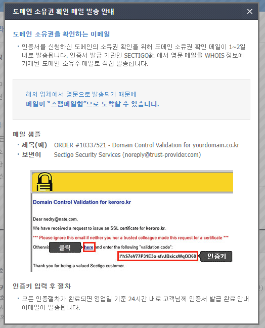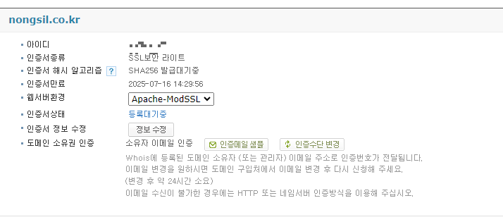 인증서 관리에서 구매한 인증서 발급 대기중을 확인할 수 있습니다.