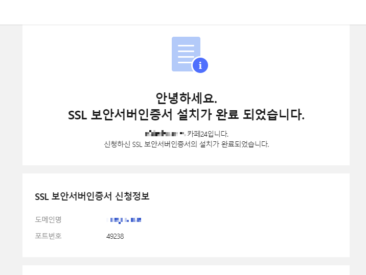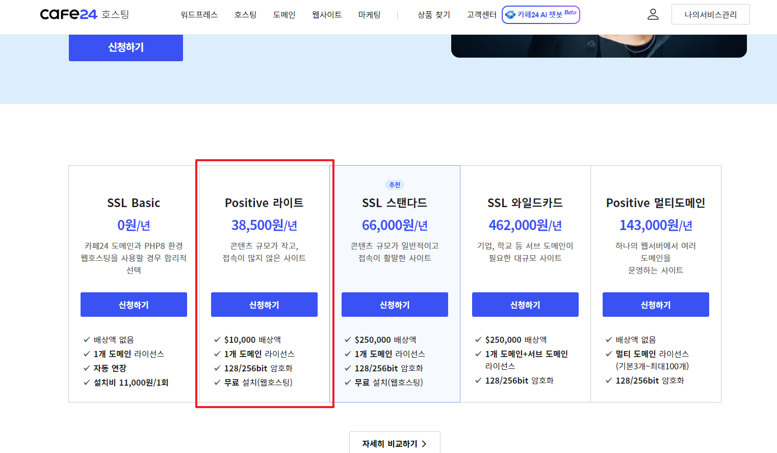 SSL 인증서는 카페24에서 Positive 라이트 인증서를 구매했습니다.