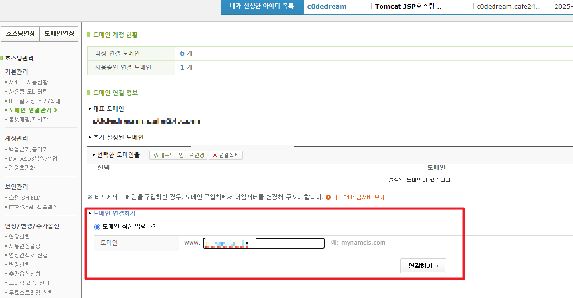 호스팅 관리에 접속해 도메인 연결관리 - 도메인 연결하기에서 구매한 도메인을 연결합니다.